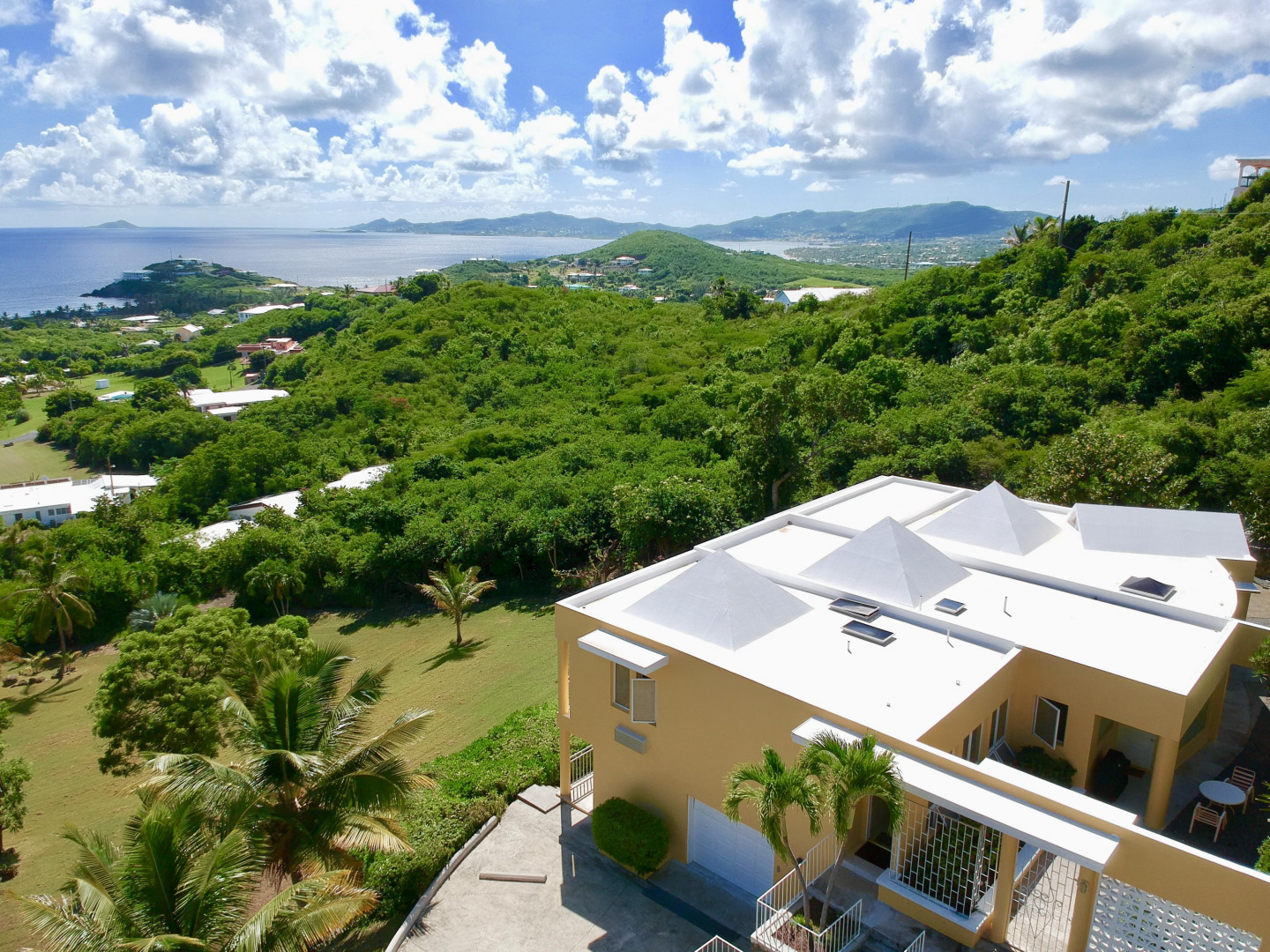 Custom built contemporary home located high up in the hills of Judith's Fancy. Enjoy the stunning panoramic views of the blue Caribbean Sea from every room in the house! For some al fresco dining, move outside to the expansive covered porch. The home features an open layout with high ceilings, recessed lighting and lots of space for entertaining. The downstairs apartment has two covered decks and its own driveway. Just 5 minutes walk takes you to the beach! If you are looking for an extremely well built and maintained home this property is definitely one to consider! New louvered windows installed in the livingroom to allow the cool breeze to flow through the house.Judith's Fancy is a gated community centrally located close to schools, shopping and the historic town of Christiansted.