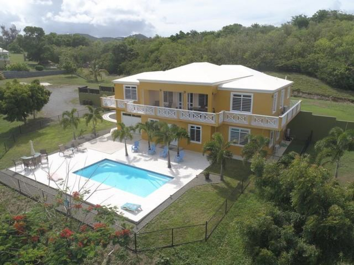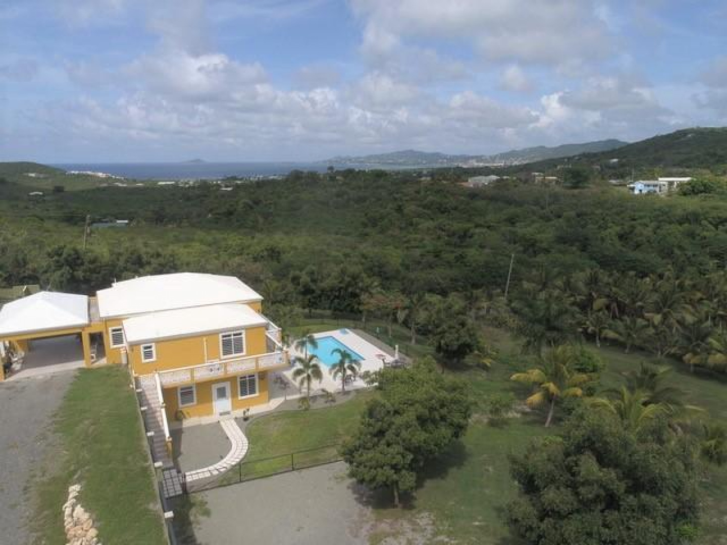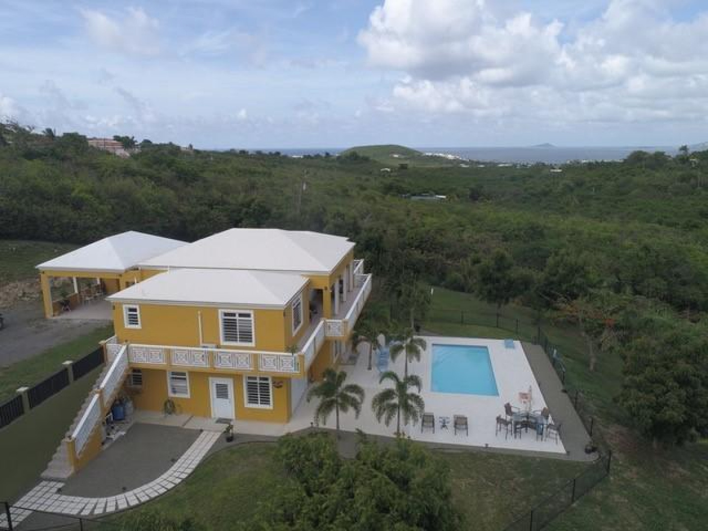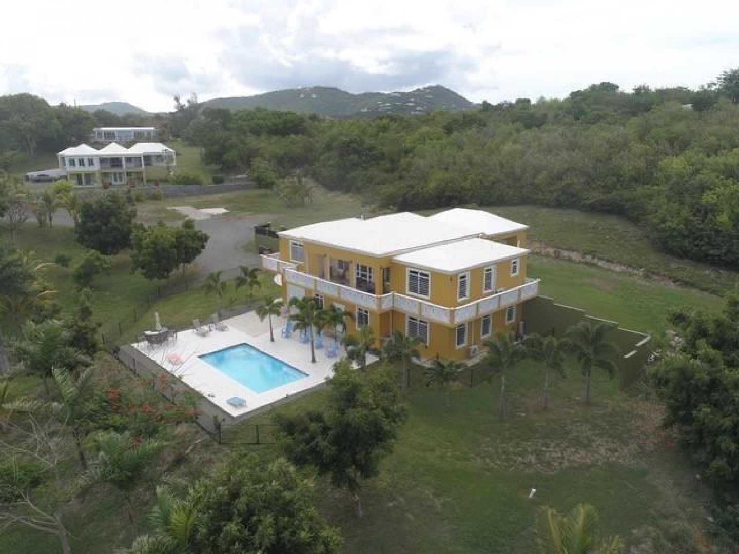 The best of everything. Built new in 2016 and of the finest materials.Living area upstairs has great room and custom kitchen, large master bedroom with gorgeous views of Buck Island and master bath. Guest room and bath, and lovely deck overlooking pool and stunning views. Additional game room with private full bath and full apartment lower level. Beautifully maintained property with fruit trees and 2 acres of privacy. Automatic 22K propane generator. 250 bulk tank, two 20,000 gallon cisterns make this the perfect island home. Sold furnished and Buyer pays stamp tax.
