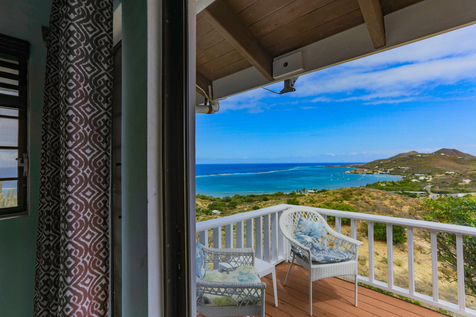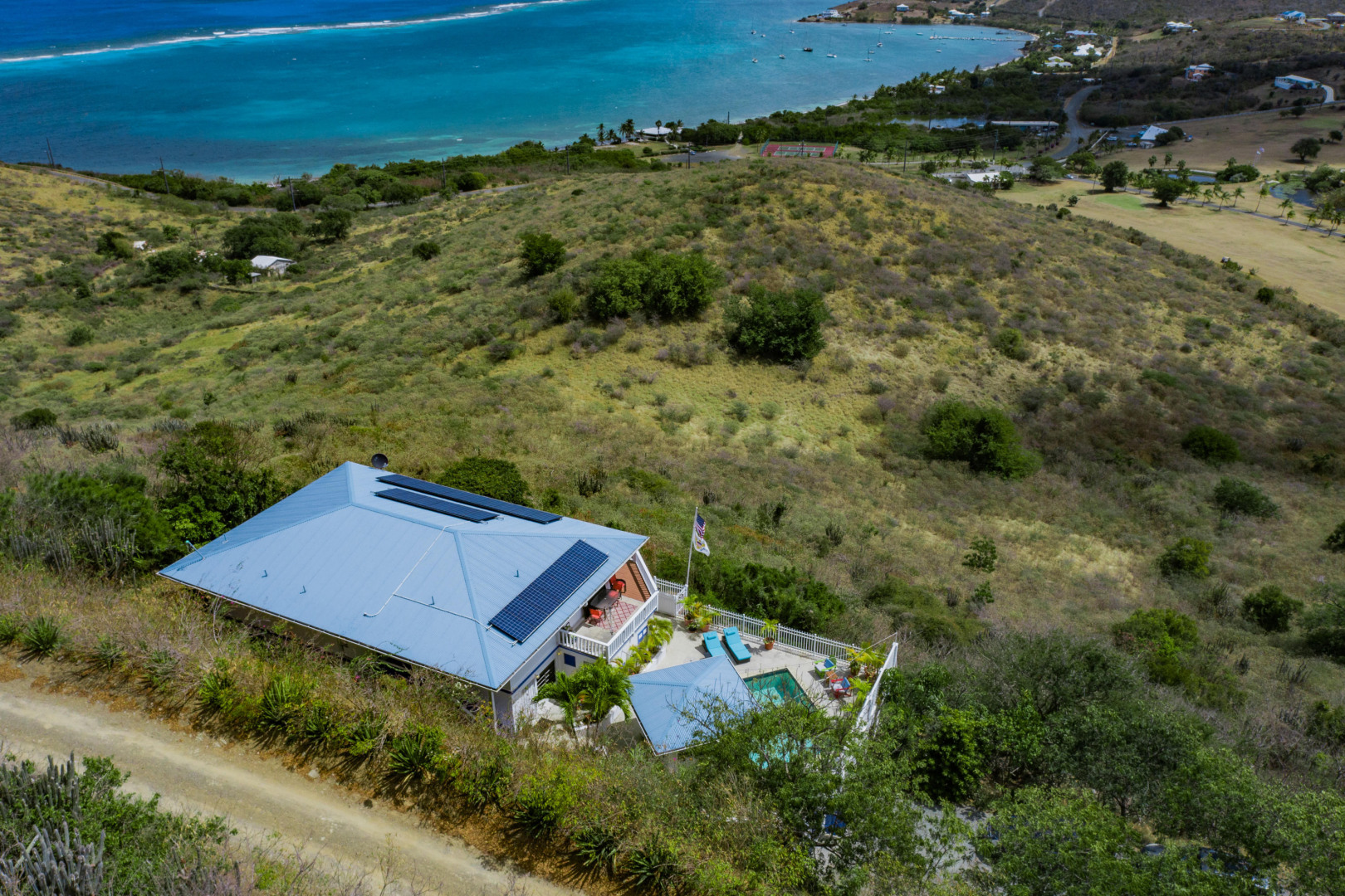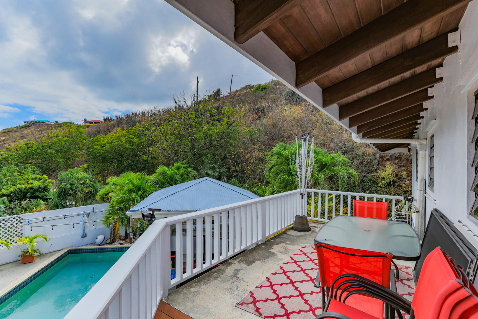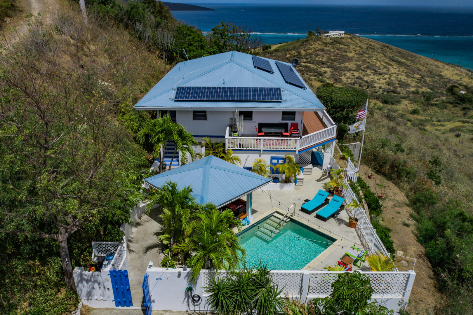 Big views East over Teague Bay to the Yacht Club from this 2-bedroom, 2-bath East End Villa with 1-bedroom apartment below. Tropical courtyard w/ outdoor shower, pool cabana, outdoor kitchen & wet bar, 26 solar panels, net-metering, Tesla battery & 20KW diesel generator! Main house has a covered gallery off LR, pass through kitchen, cathedral ceilings, en-suite bath w/ double vanity off main bedroom, W/D. Apartment features full kitchen, W/D, sofa bed that converts into either 2 twins or a king, private outdoor dining gallery w/ Buck Island views. Tucked away in a very private location - this is your ideal island hideaway!