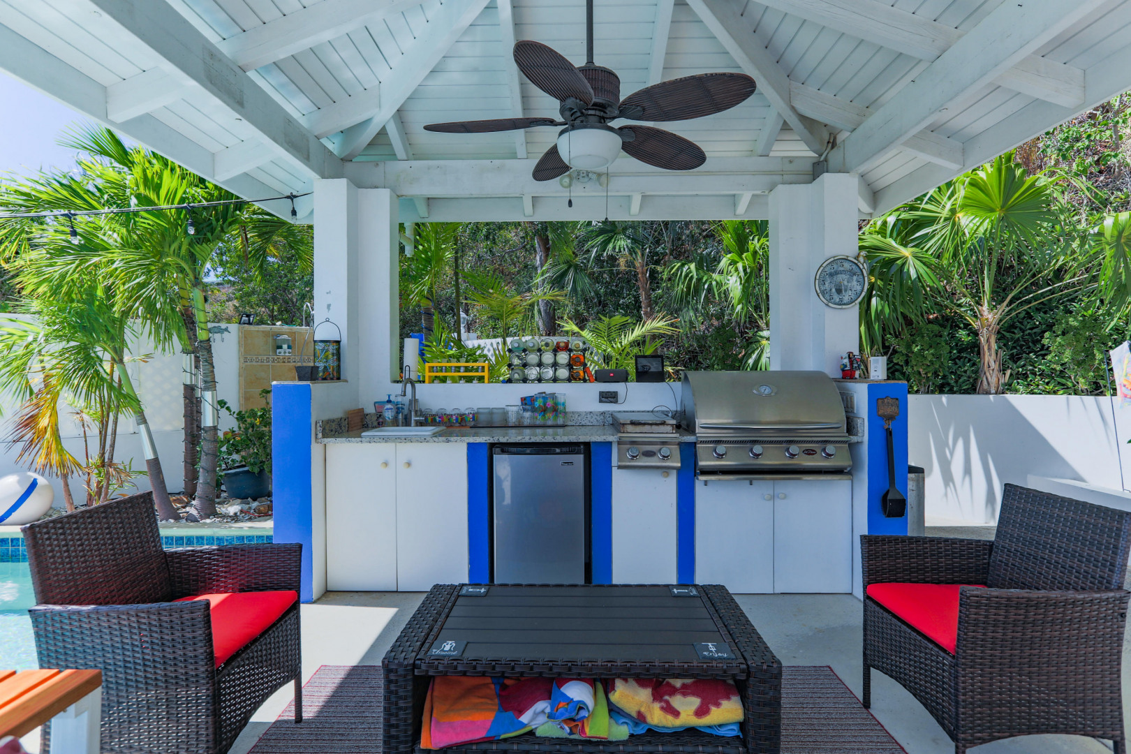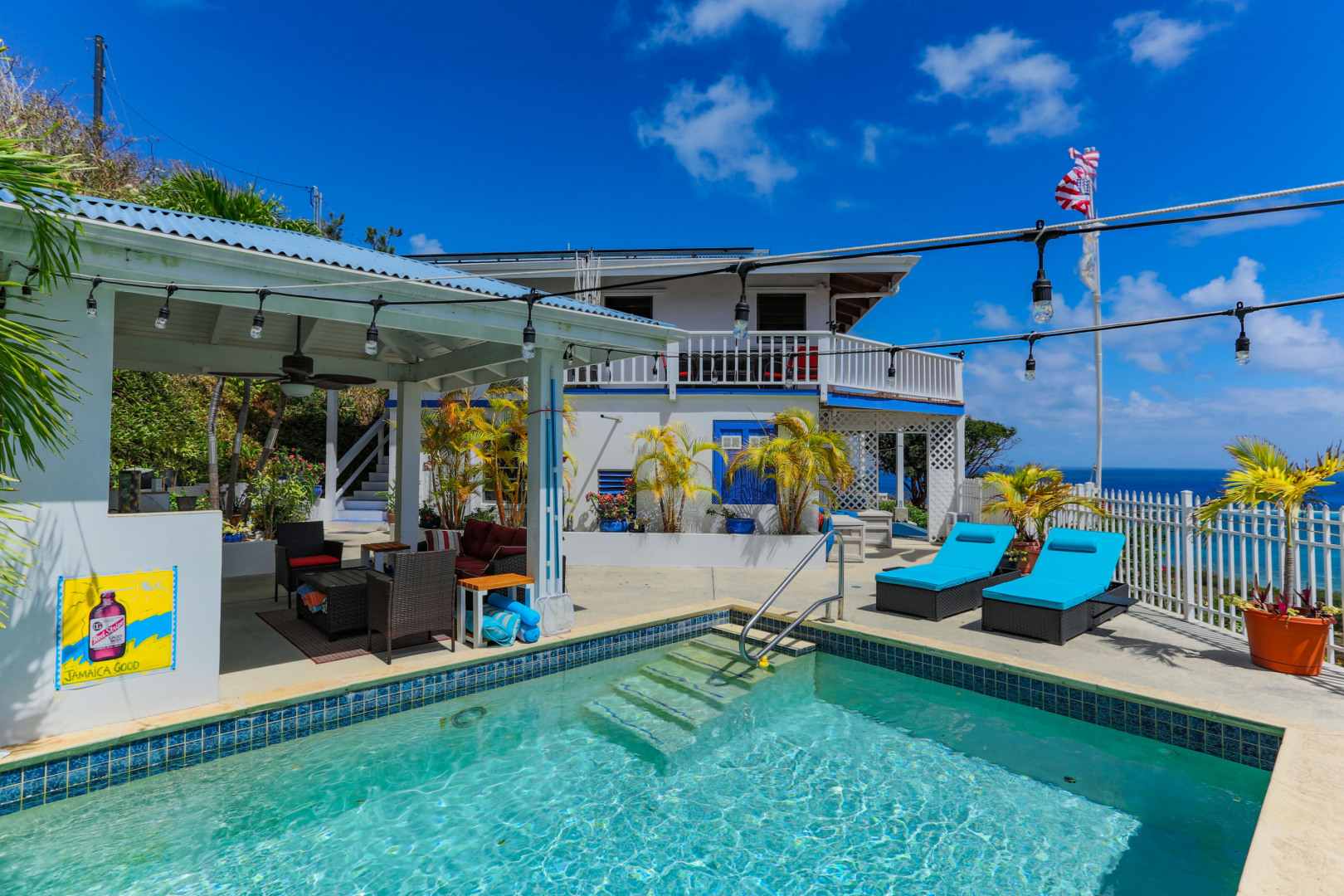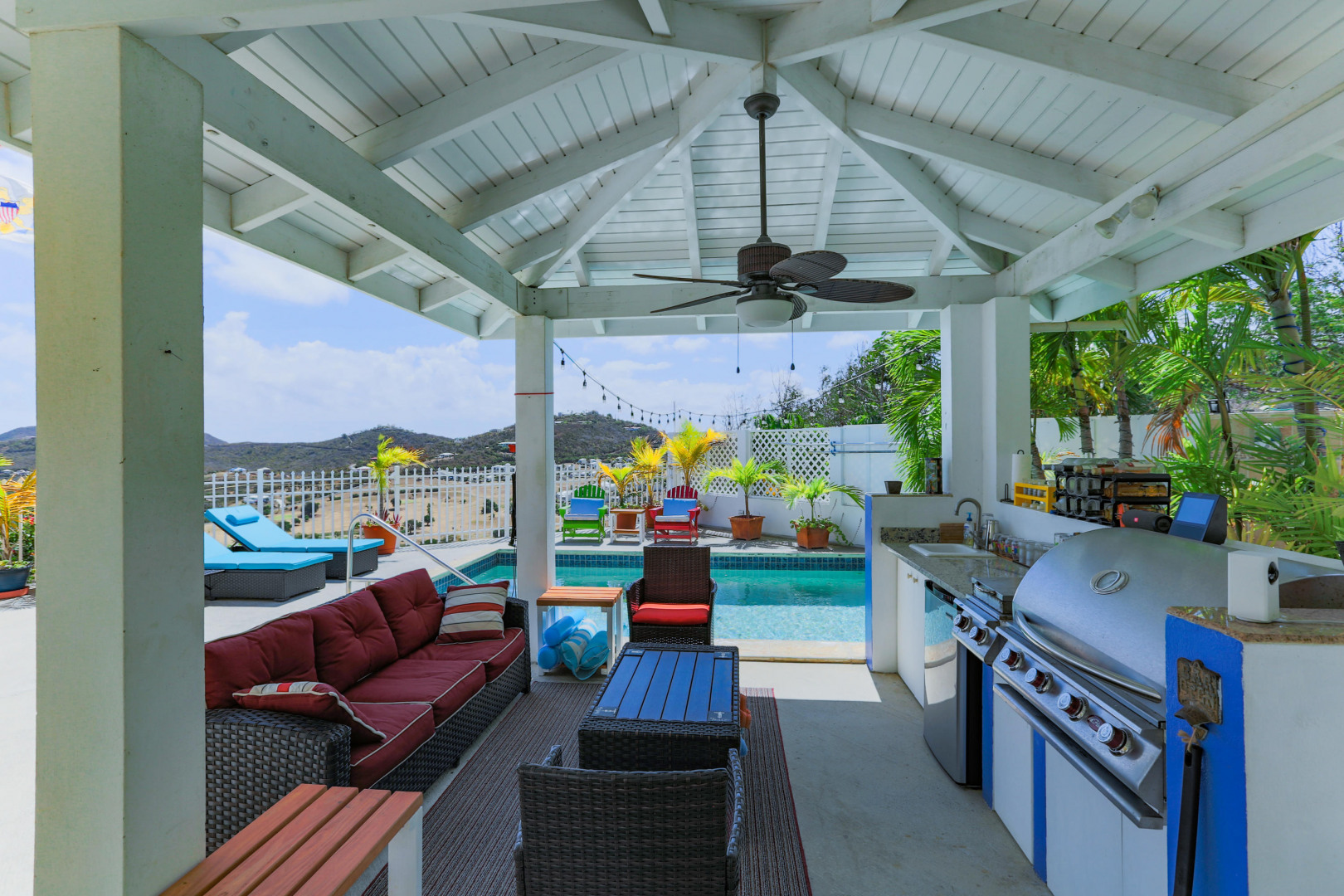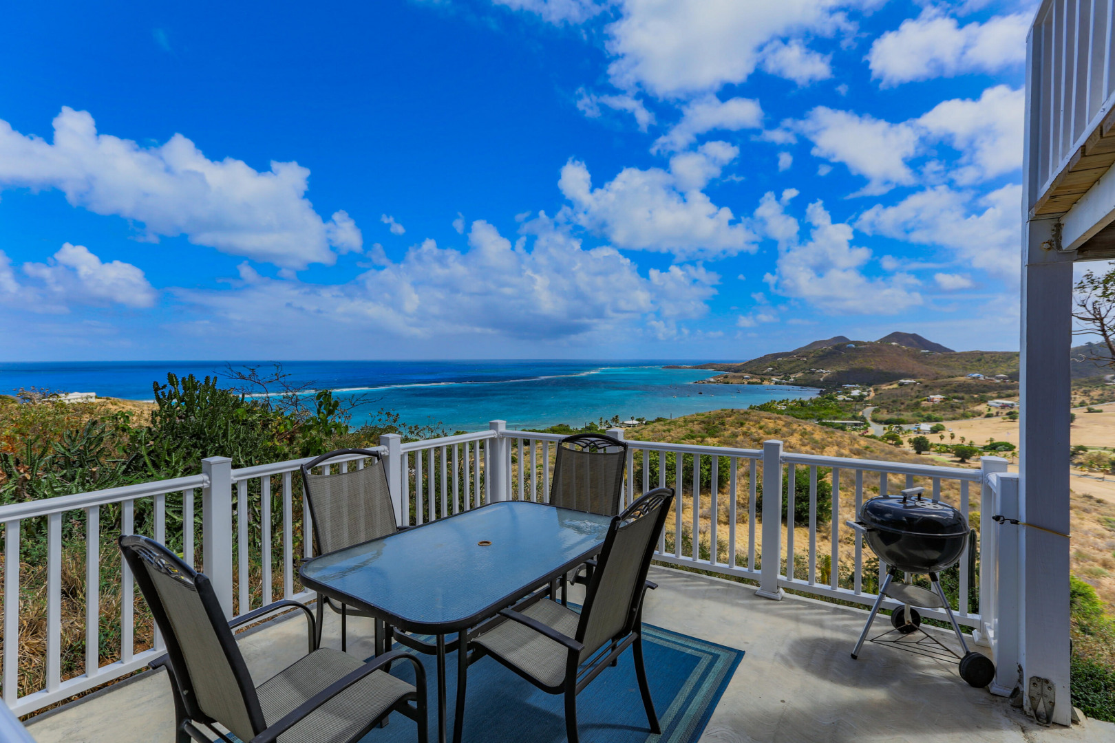 Big views East over Teague Bay to the Yacht Club from this 2-bedroom, 2-bath East End Villa with 1-bedroom apartment below. Tropical courtyard w/ outdoor shower, pool cabana, outdoor kitchen & wet bar, 26 solar panels, net-metering, Tesla battery & 20KW diesel generator! Main house has a covered gallery off LR, pass through kitchen, cathedral ceilings, en-suite bath w/ double vanity off main bedroom, W/D. Apartment features full kitchen, W/D, sofa bed that converts into either 2 twins or a king, private outdoor dining gallery w/ Buck Island views. Tucked away in a very private location - this is your ideal island hideaway!