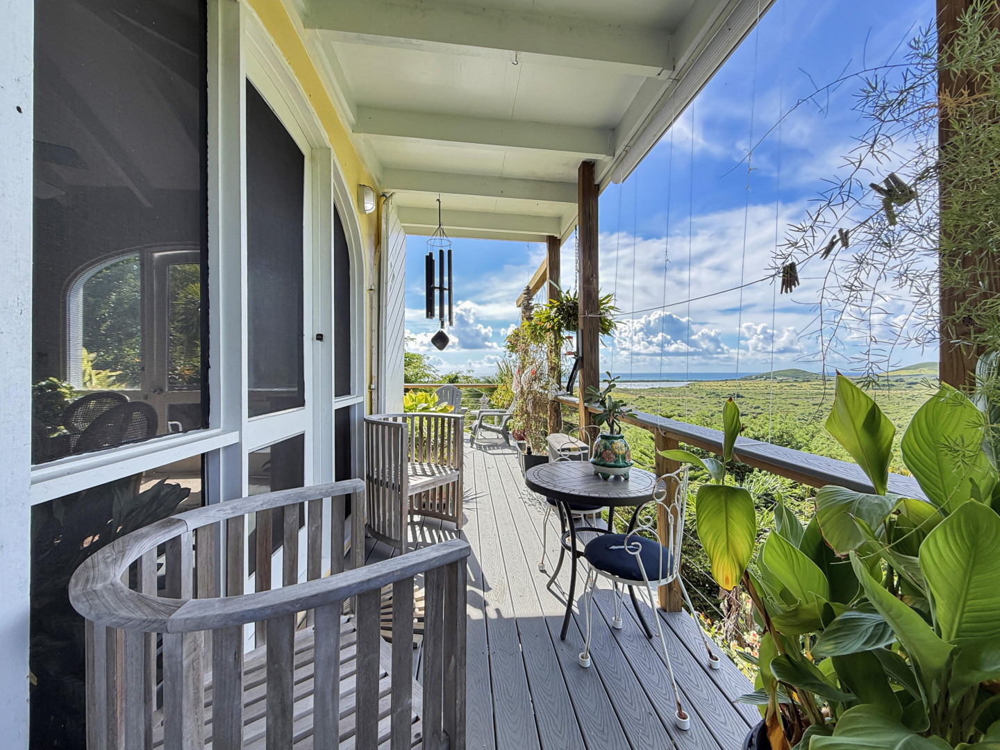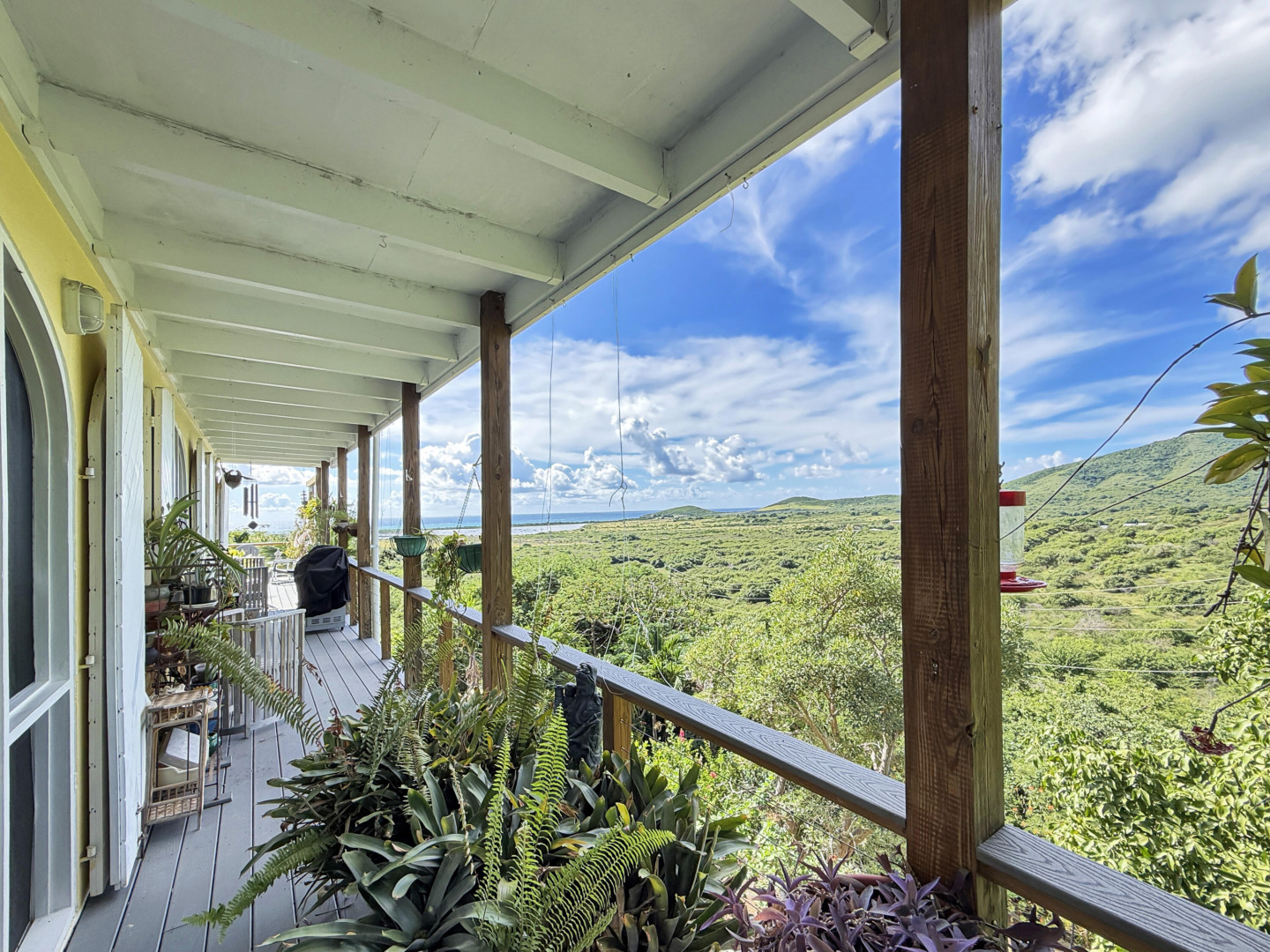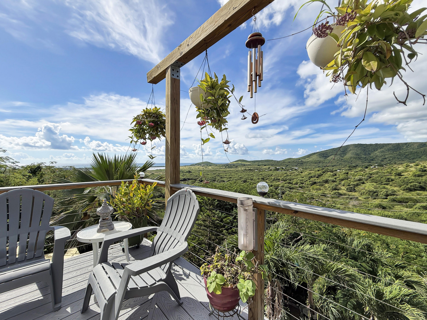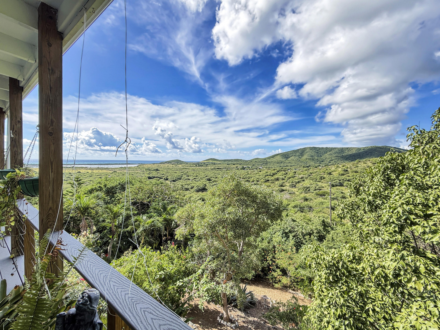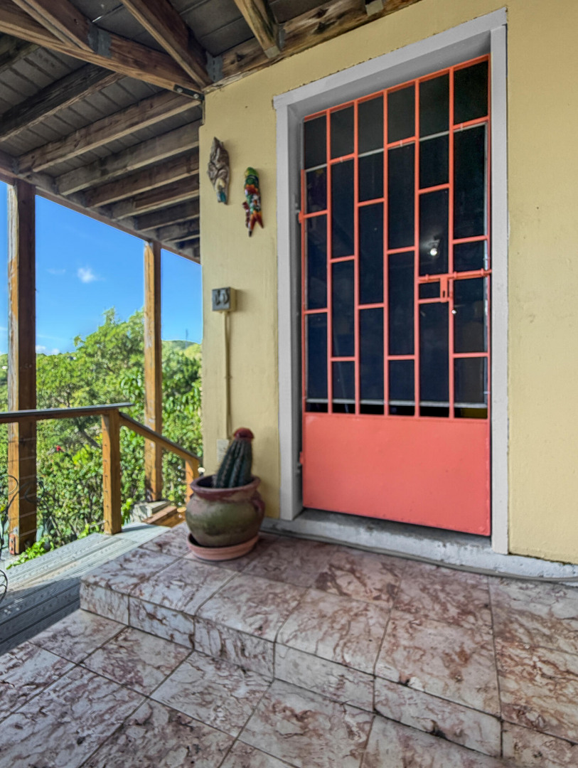 Discover rural peace and quiet, and outstanding views less than 10 minutes from Christiansted in a charming home with many beautiful design details!The owners thoughtfully built this home to maximize the expansive views and capture the breezes. This home has vaulted ceilings, Turkish Travertine tile floors, a salt water pool, solid mahogany doors, a chef's kitchen with custom mahogany plywood kitchen cabinets, Trex decking on the gallery and upper patio, solar panels with net metering, built-in mahogany bookcases and shelves, & a hillside garden with a wide variety of tropical plants, trails, & places to sit. The lower level studio apartment can be rented, be a separate place for guests to stay, or used as an office. This property has been meticulously maintained & cared for.