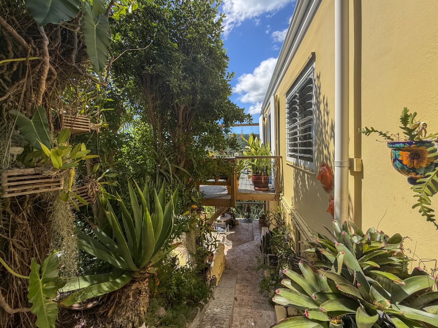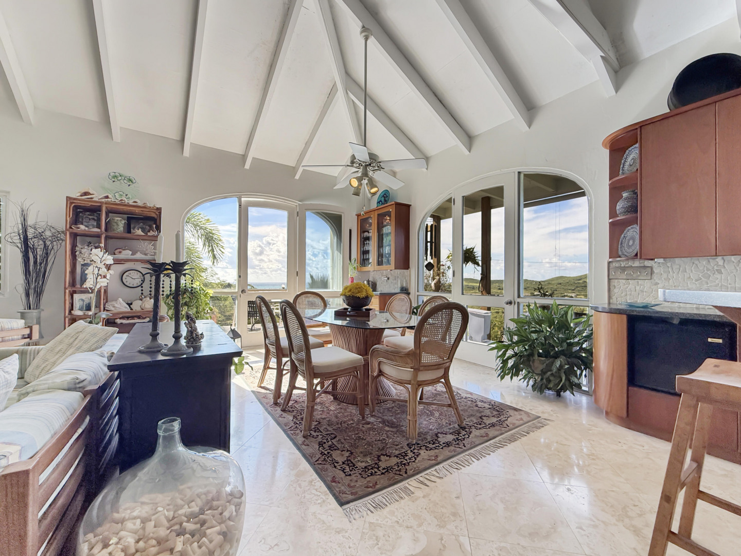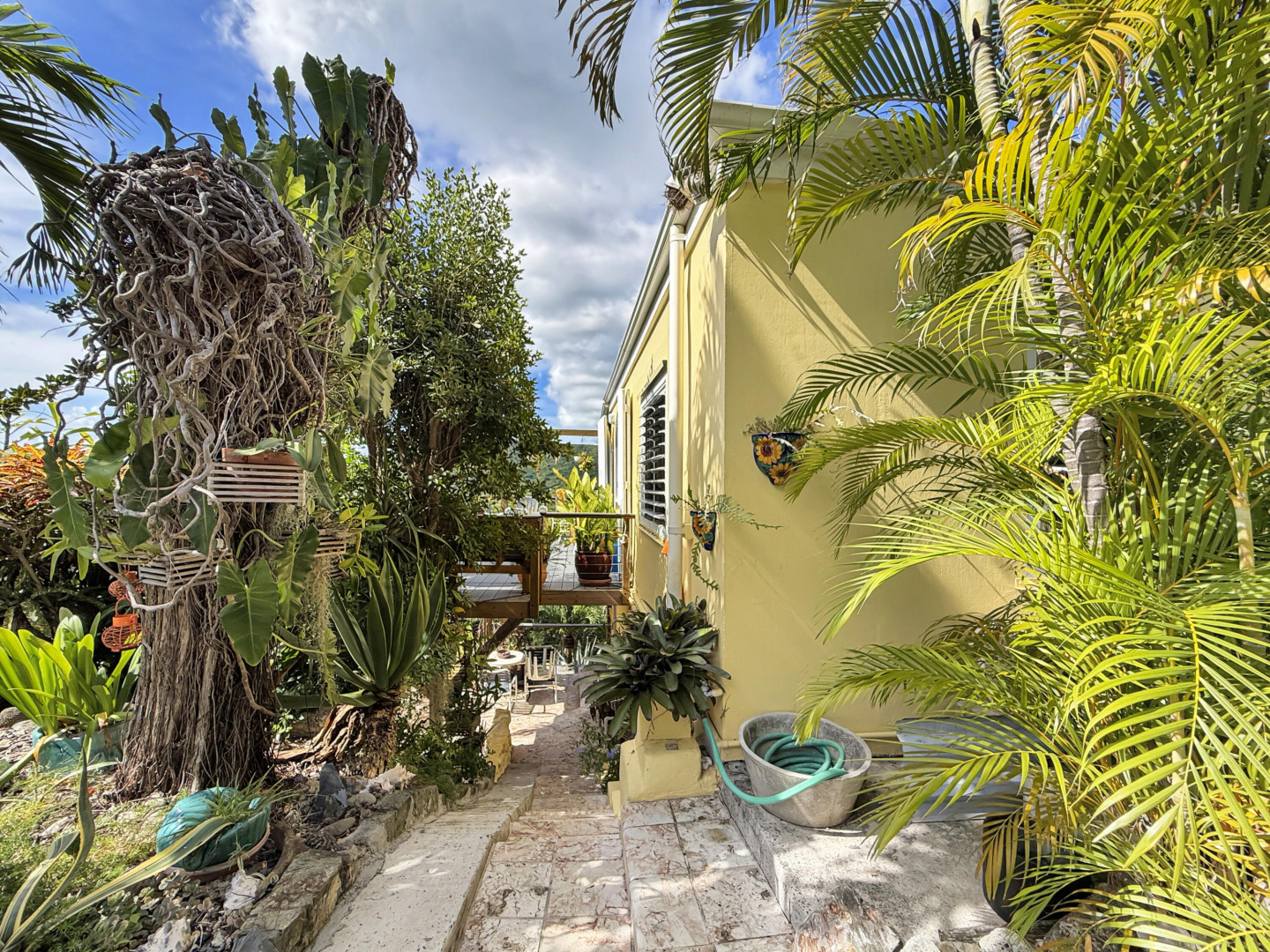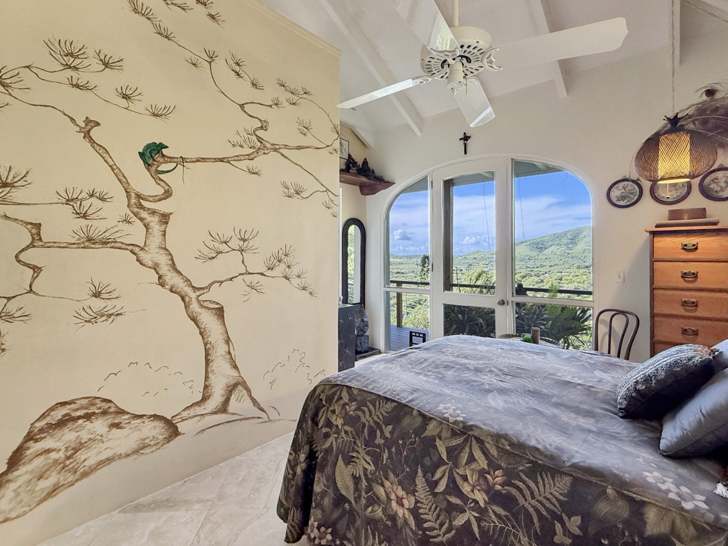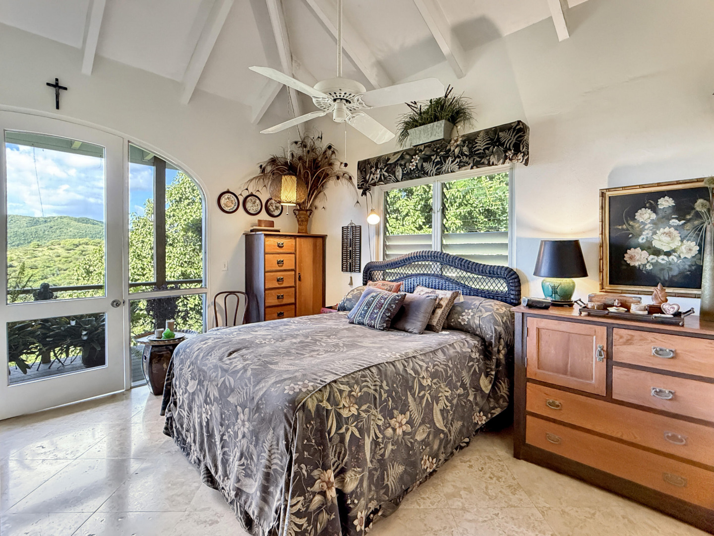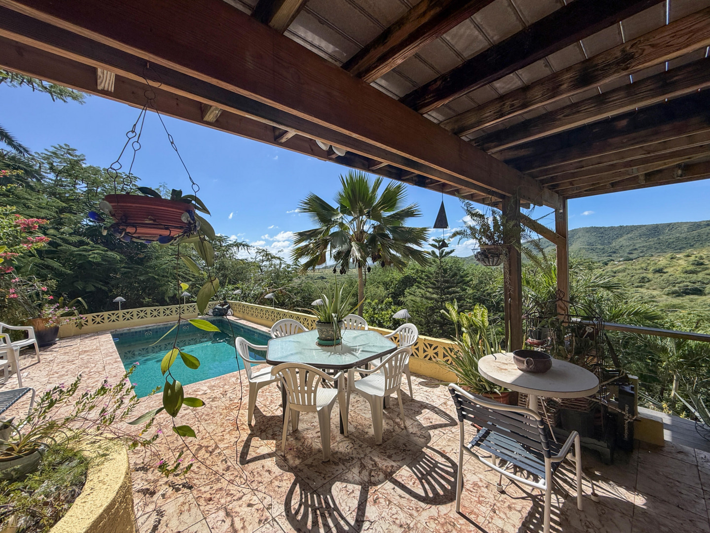 Discover rural peace and quiet, and outstanding views less than 10 minutes from Christiansted in a charming home with many beautiful design details!The owners thoughtfully built this home to maximize the expansive views and capture the breezes. This home has vaulted ceilings, Turkish Travertine tile floors, a salt water pool, solid mahogany doors, a chef's kitchen with custom mahogany plywood kitchen cabinets, Trex decking on the gallery and upper patio, solar panels with net metering, built-in mahogany bookcases and shelves, & a hillside garden with a wide variety of tropical plants, trails, & places to sit. The lower level studio apartment can be rented, be a separate place for guests to stay, or used as an office. This property has been meticulously maintained & cared for.