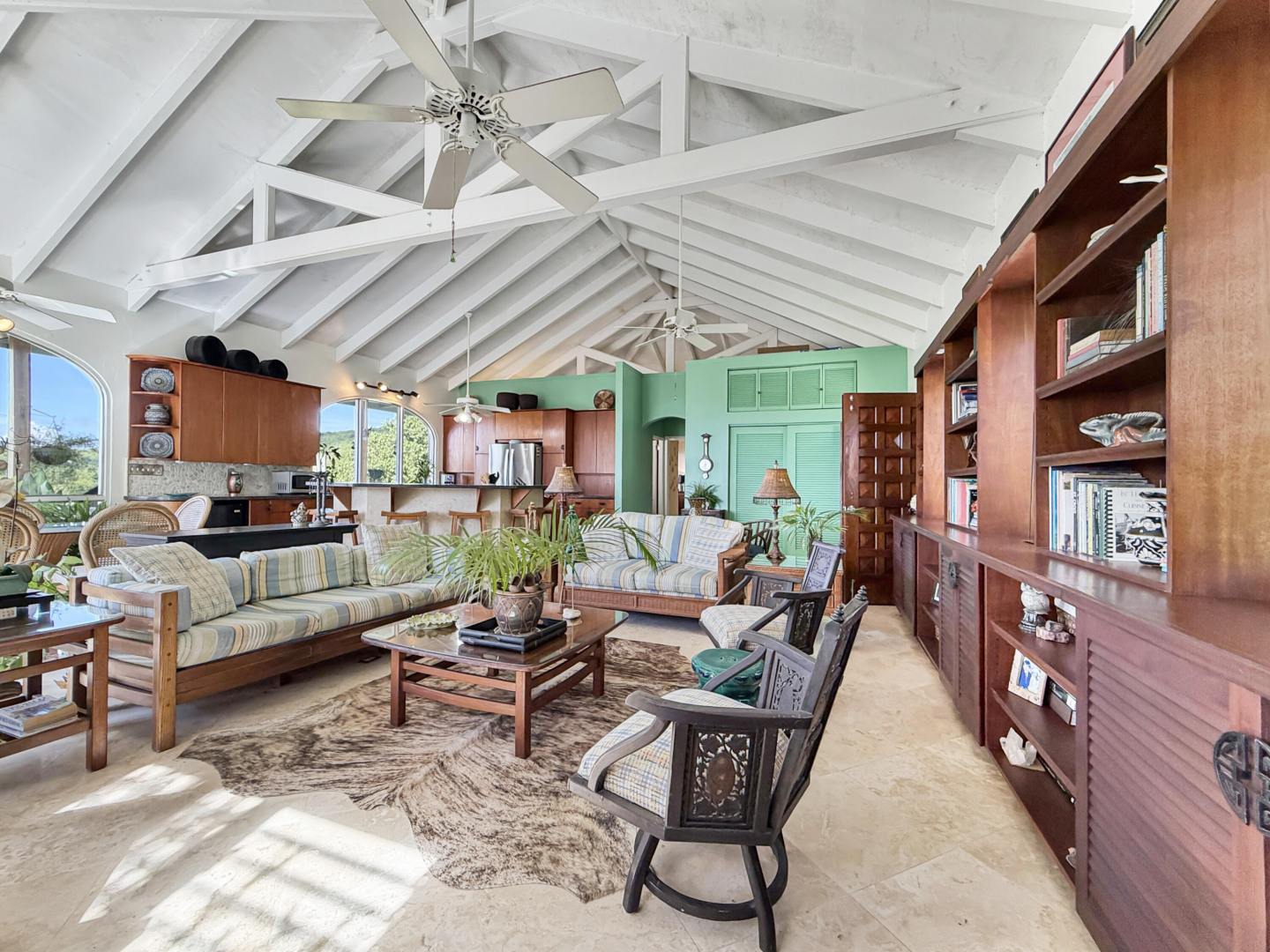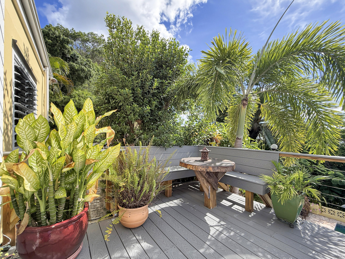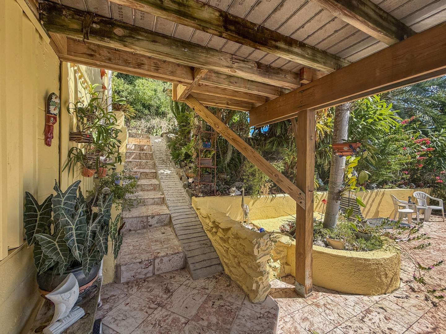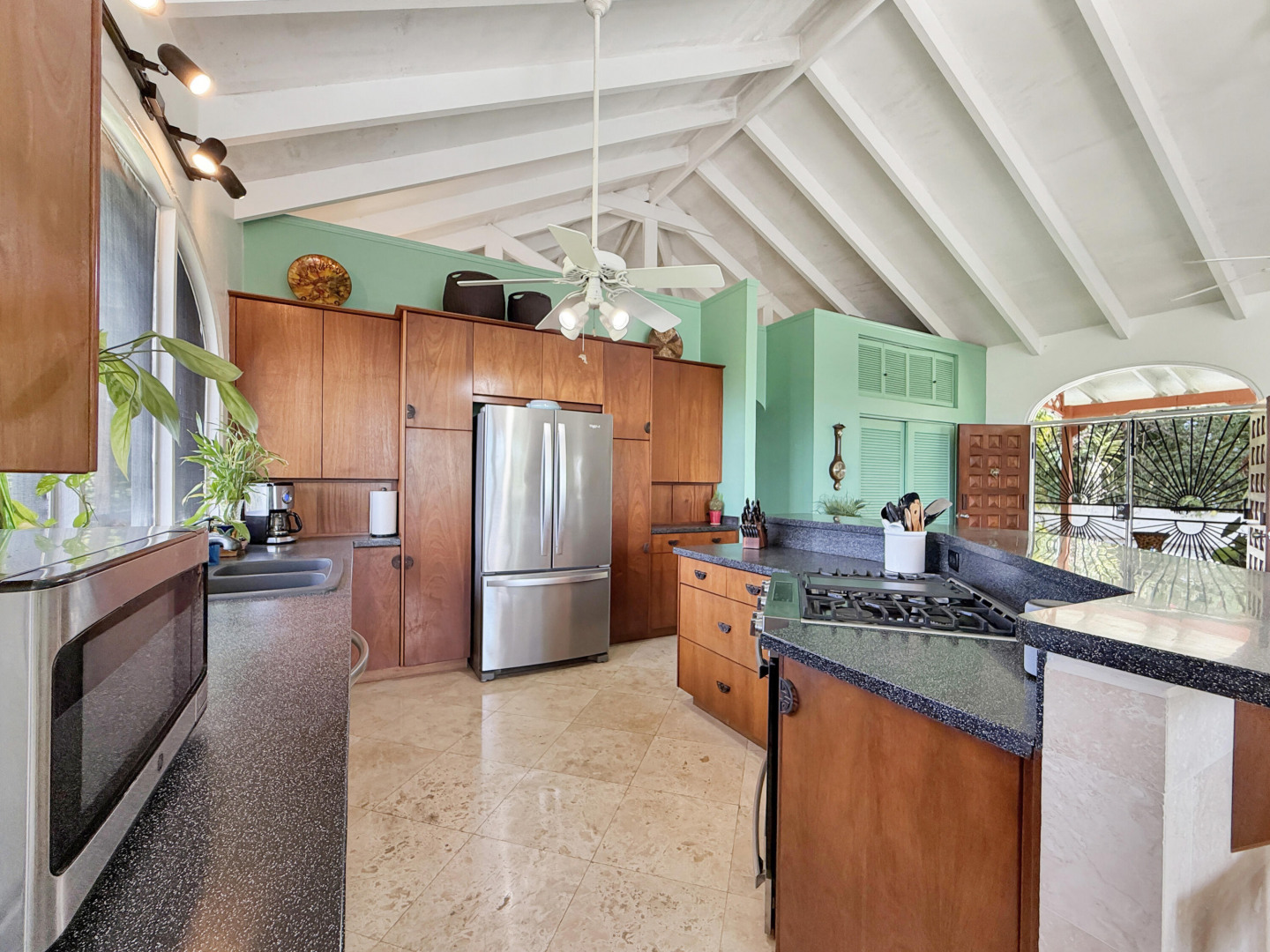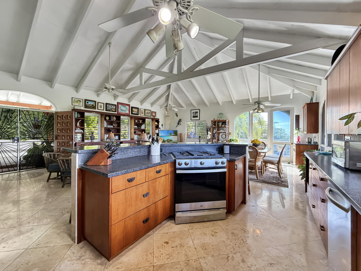 Discover rural peace and quiet, and outstanding views less than 10 minutes from Christiansted in a charming home with many beautiful design details!The owners thoughtfully built this home to maximize the expansive views and capture the breezes. This home has vaulted ceilings, Turkish Travertine tile floors, a salt water pool, solid mahogany doors, a chef's kitchen with custom mahogany plywood kitchen cabinets, Trex decking on the gallery and upper patio, solar panels with net metering, built-in mahogany bookcases and shelves, & a hillside garden with a wide variety of tropical plants, trails, & places to sit. The lower level studio apartment can be rented, be a separate place for guests to stay, or used as an office. This property has been meticulously maintained & cared for.