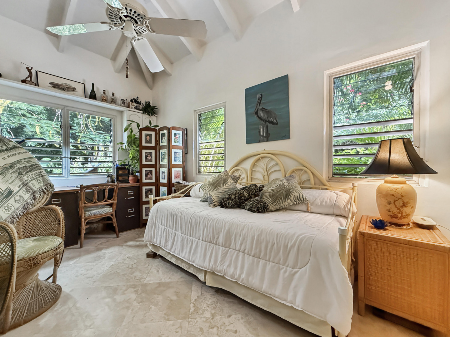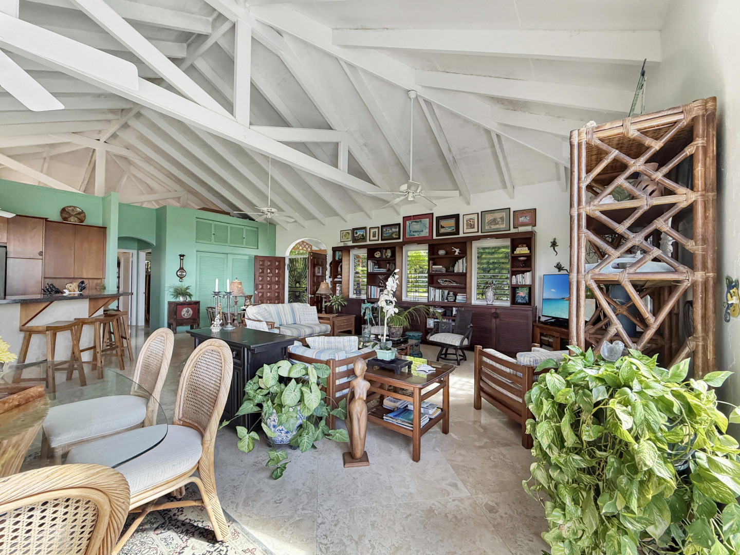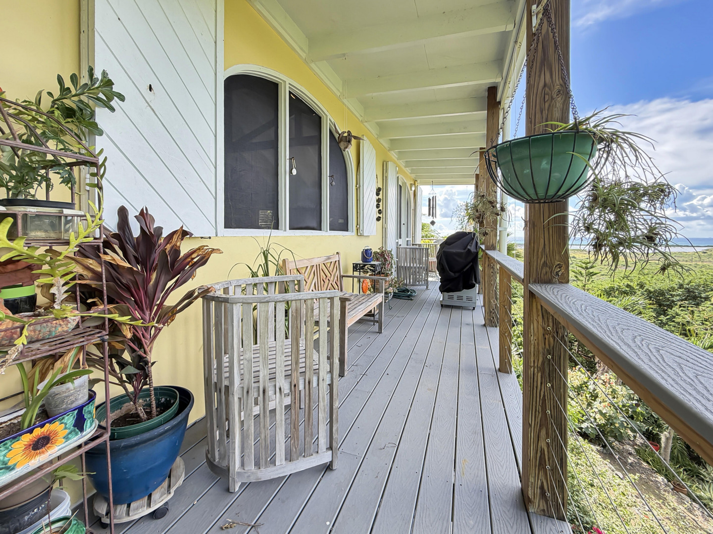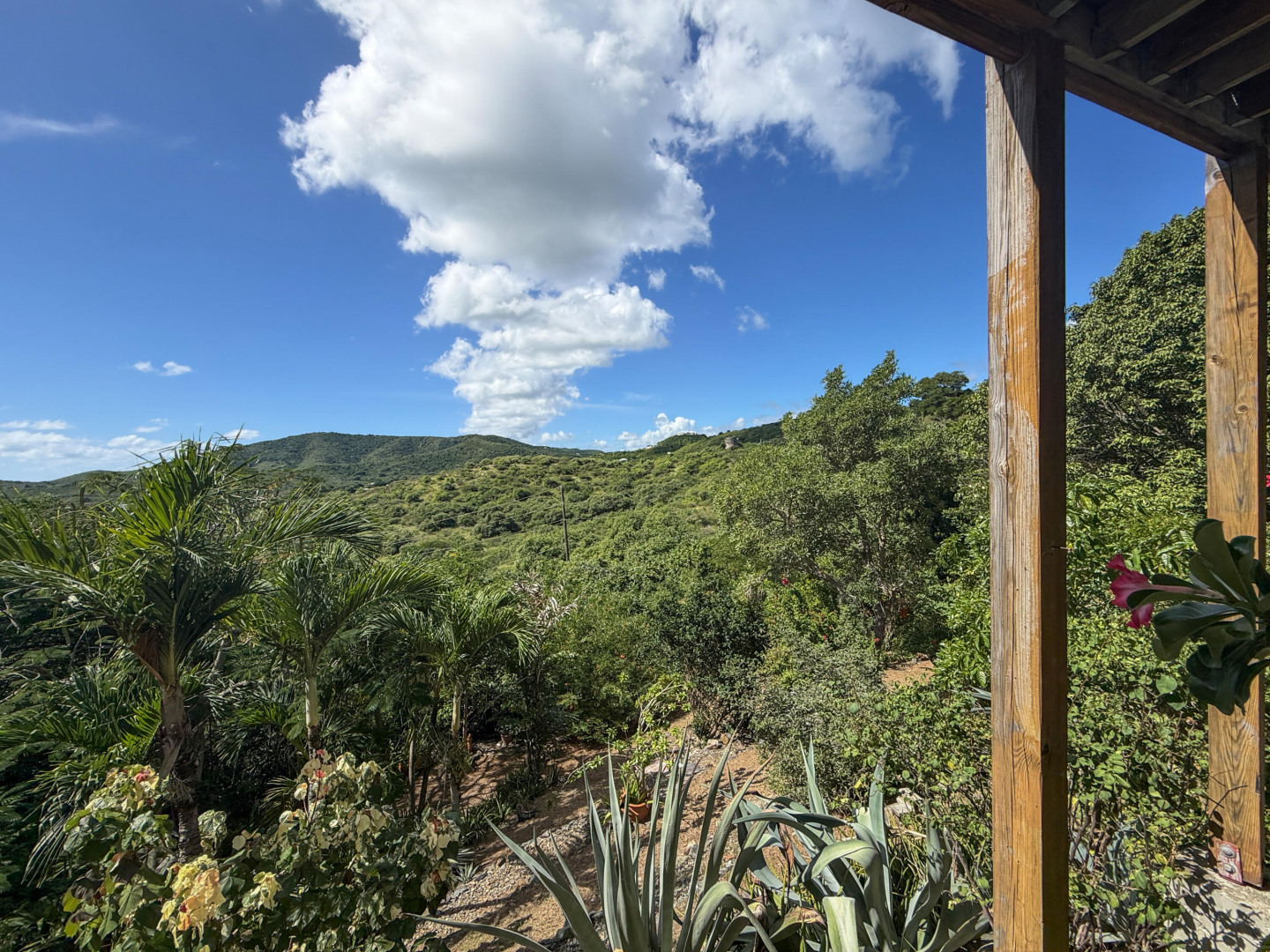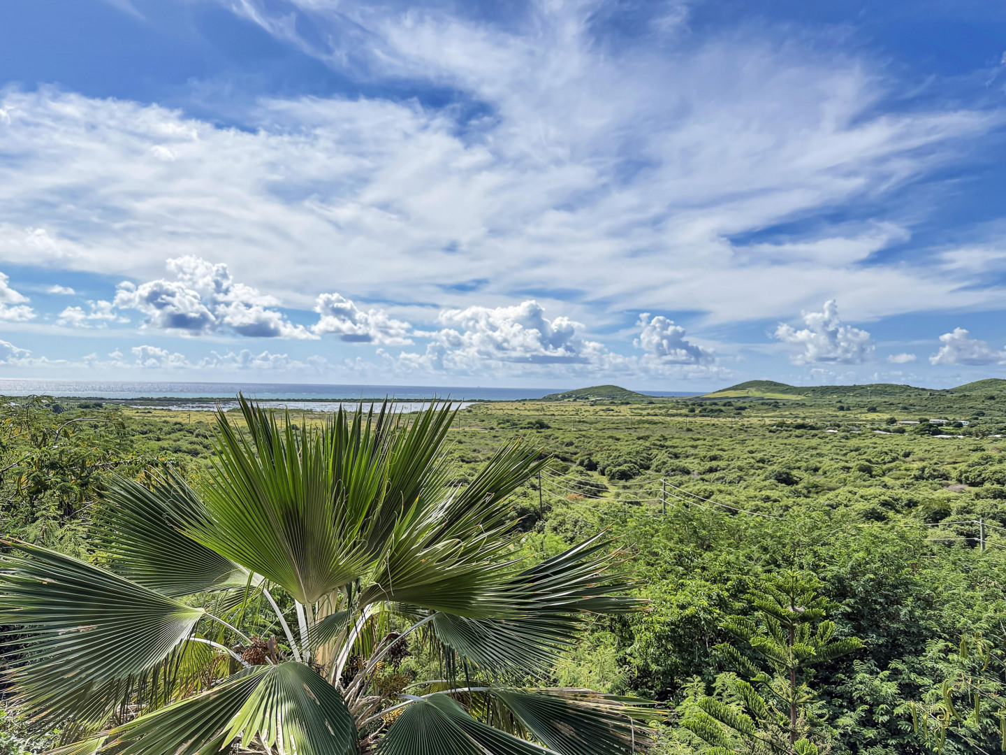 Discover rural peace and quiet, and outstanding views less than 10 minutes from Christiansted in a charming home with many beautiful design details!The owners thoughtfully built this home to maximize the expansive views and capture the breezes. This home has vaulted ceilings, Turkish Travertine tile floors, a salt water pool, solid mahogany doors, a chef's kitchen with custom mahogany plywood kitchen cabinets, Trex decking on the gallery and upper patio, solar panels with net metering, built-in mahogany bookcases and shelves, & a hillside garden with a wide variety of tropical plants, trails, & places to sit. The lower level studio apartment can be rented, be a separate place for guests to stay, or used as an office. This property has been meticulously maintained & cared for.