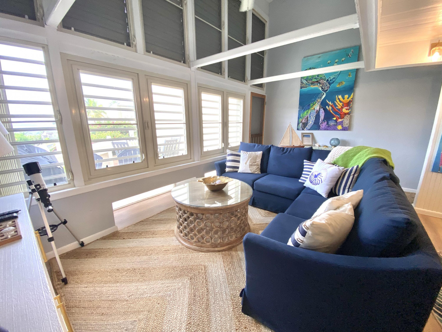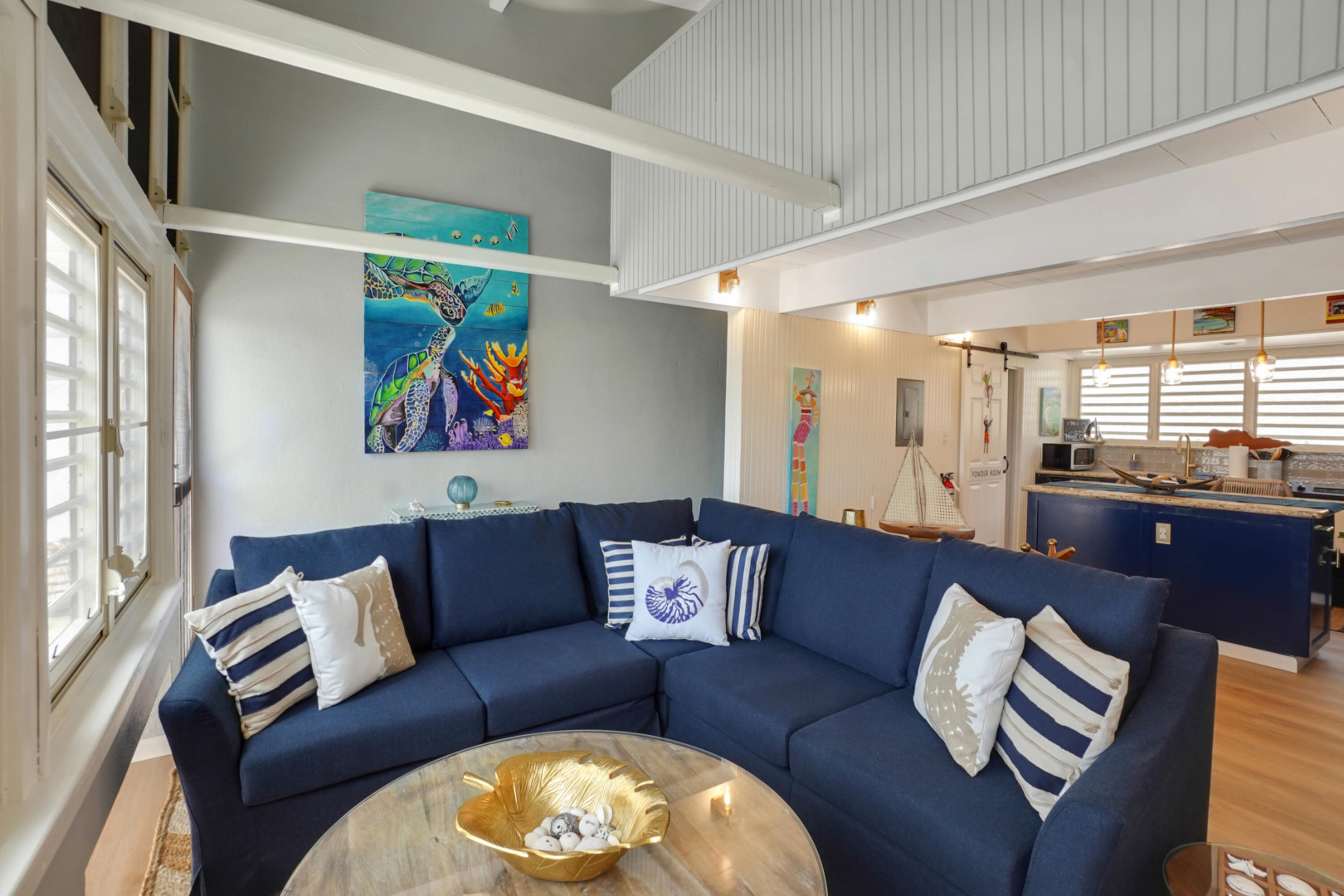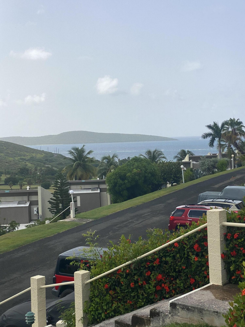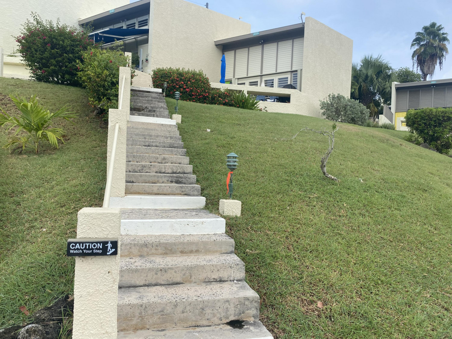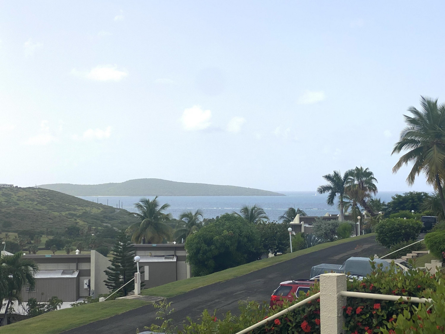 Step into an island oasis! This 1 bedroom, 1.5 bath condo is turn-key and ready for you to enjoy Buck Island views. Located on the East end on a 9-hole golf course, with a disc golf course, 2 tennis courts, pickleball, a pro shop, nearby beach access, Duggan's Reef, Ollies Cafe and a gorgeous pool! This unit has been remodeled and upgrades abound! Here's a few of the major upgrades done within the last 3 years: new windows ,2 skylights, accordion hurricane shutters, interior paint, Luxury Vinyl Tile flooring downstairs, all new lighting throughout, added a full-size washer and dryer, water heater, dishwasher, updated the outdoor shower with a custom tile mural! It has a great short term rental history with wonderful reviews.