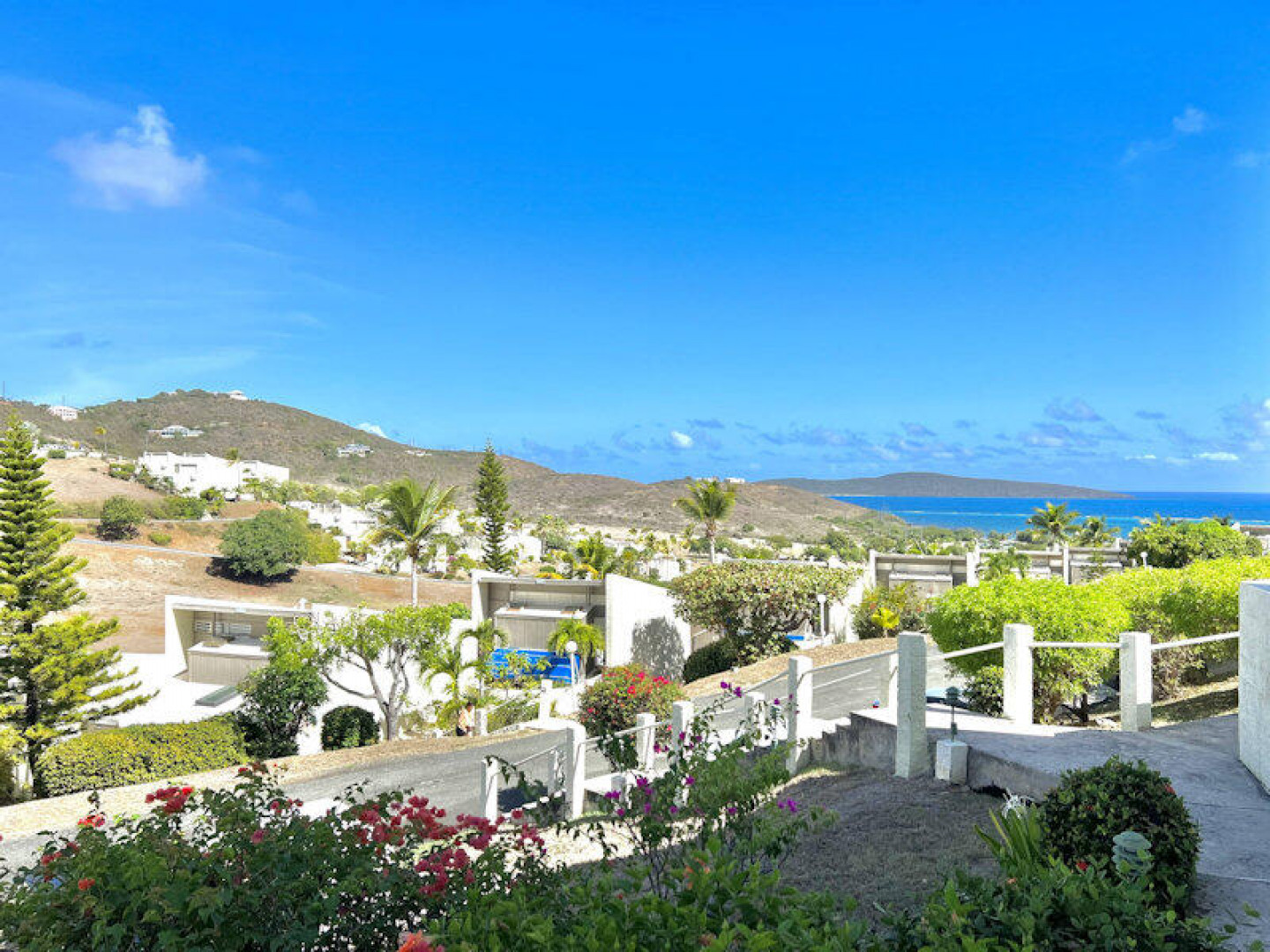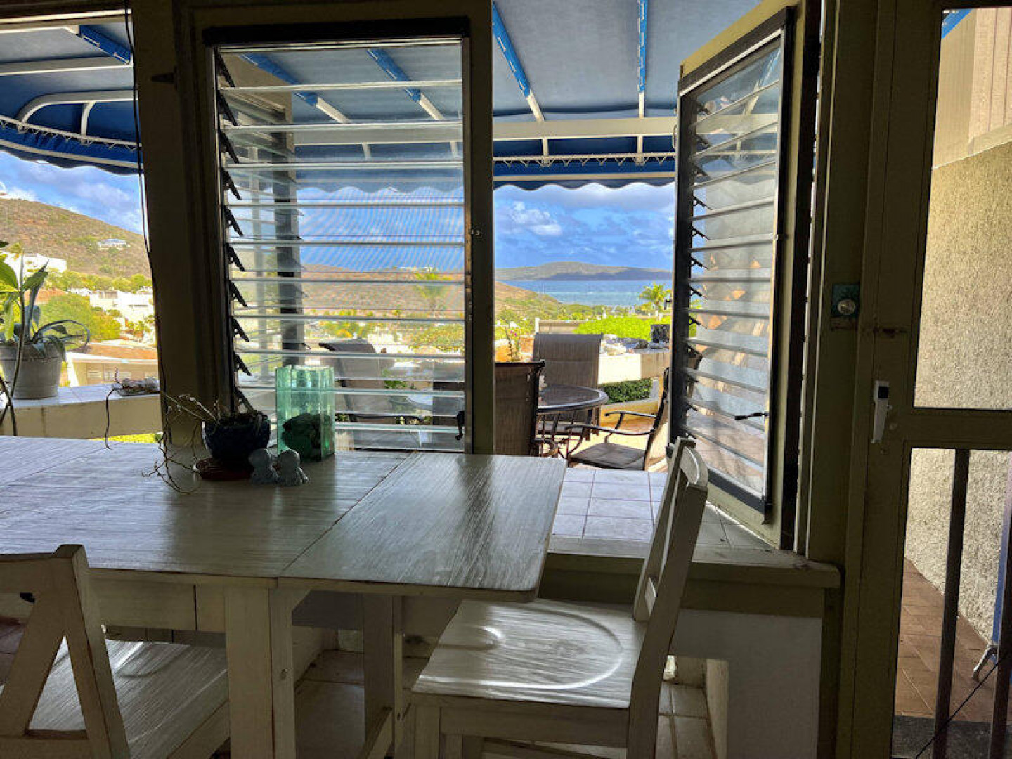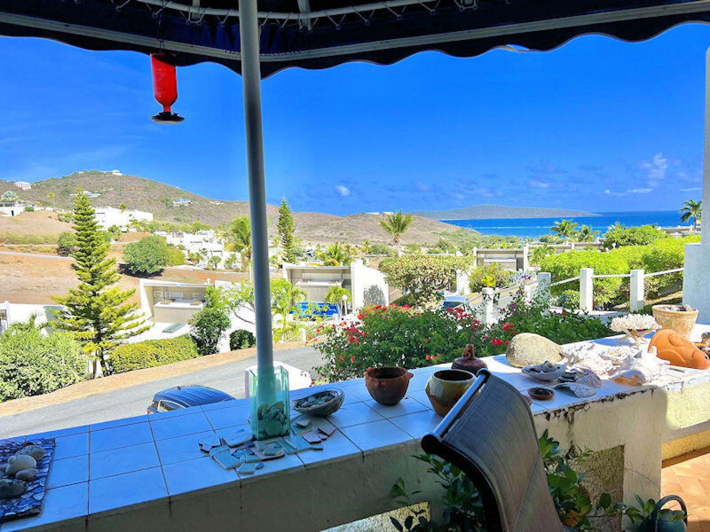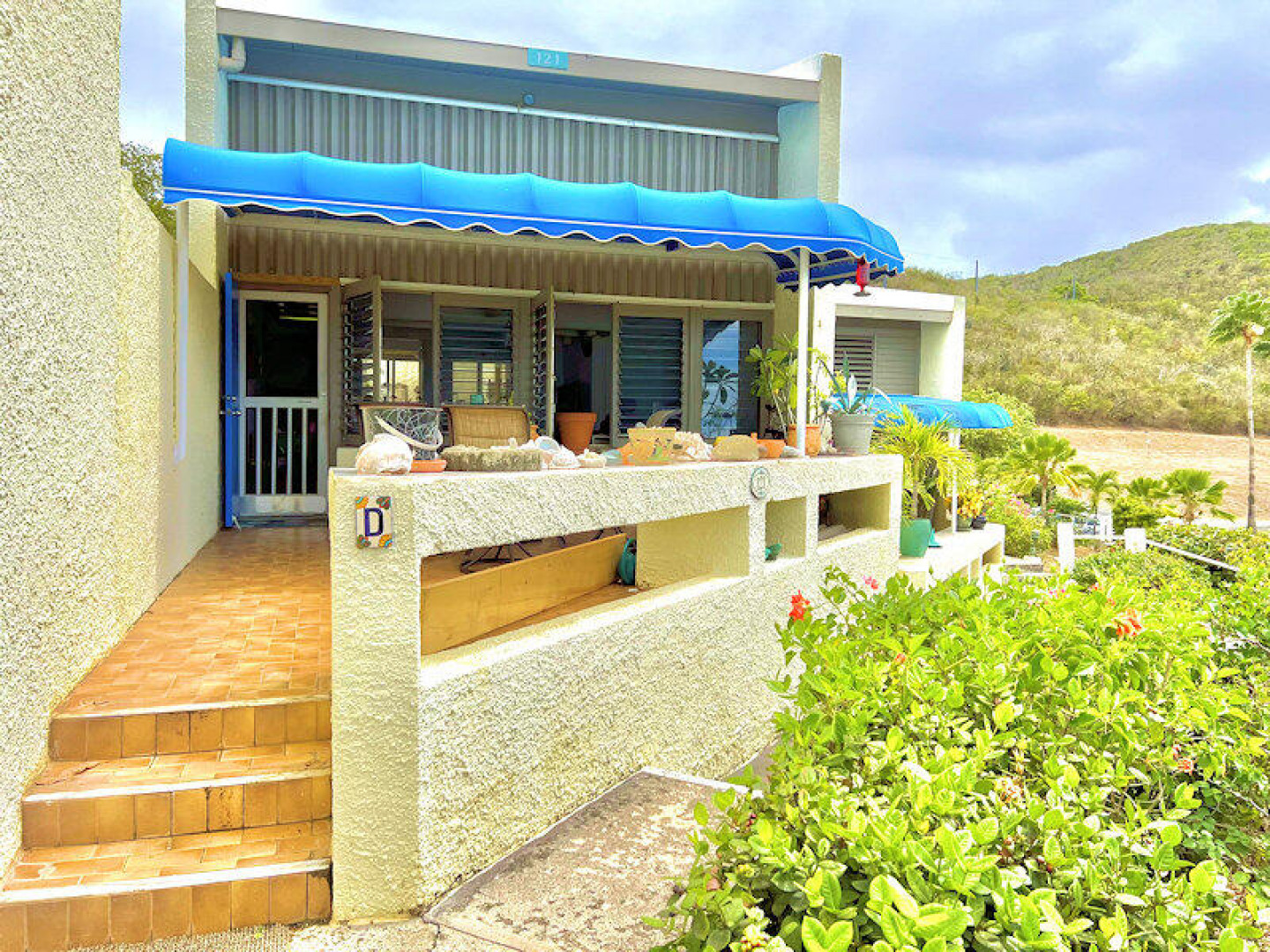 This 1 bed/1.5 bath condo in the sought-after community of The Reef has it all--a spectacular view of Buck Island, unparalleled privacy for a condominium, and two delightful outdoor areas (large patio in front and smaller atrium in back). The inside is a blank canvas, a diamond in the rough and an opportunity to create your perfect space. No amount of renovating can give you what this unit already has--the view, the privacy and the outdoor living area. The rest depends on your imagination and your vision.Upgrades include a full size stack W/D, split A/C, new refrigerator,R/O cold water filter and on-demand water heater.The Reef is gated with a pool,9 hole golf course and Pro Shop, tennis/pickle ball and disc golf.Just a short walk to Teague's Bay beach and Duggan's Reef restaurant.