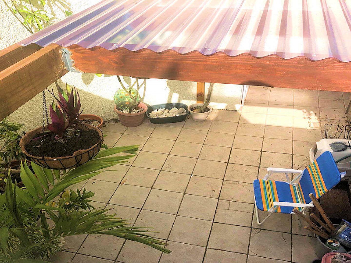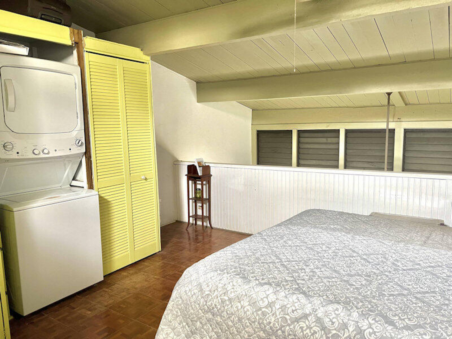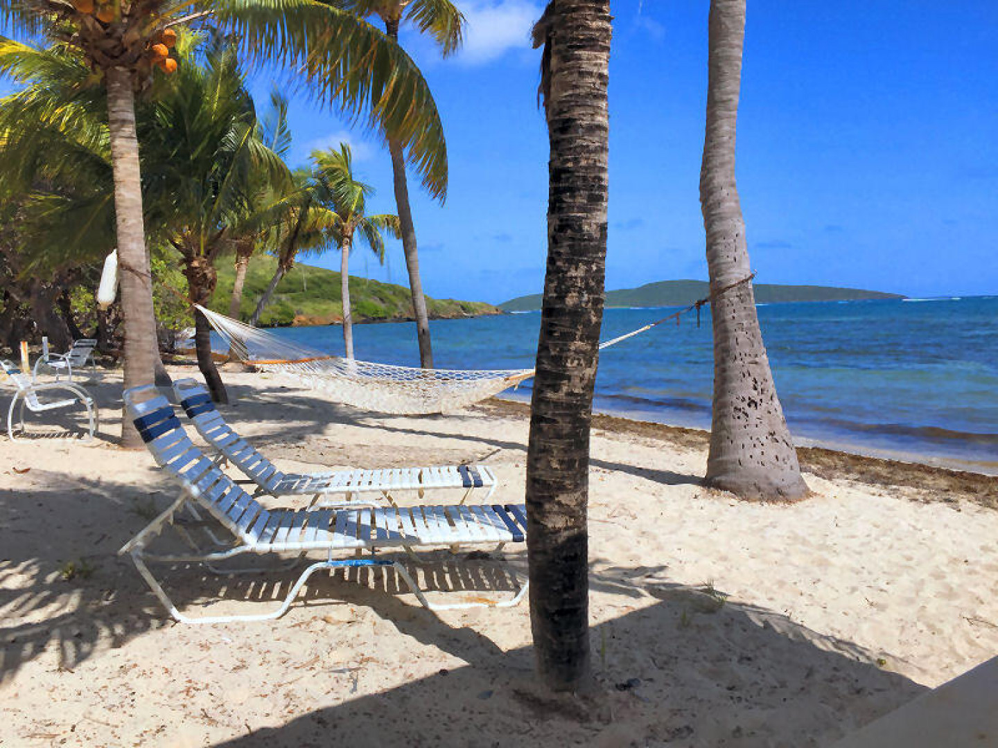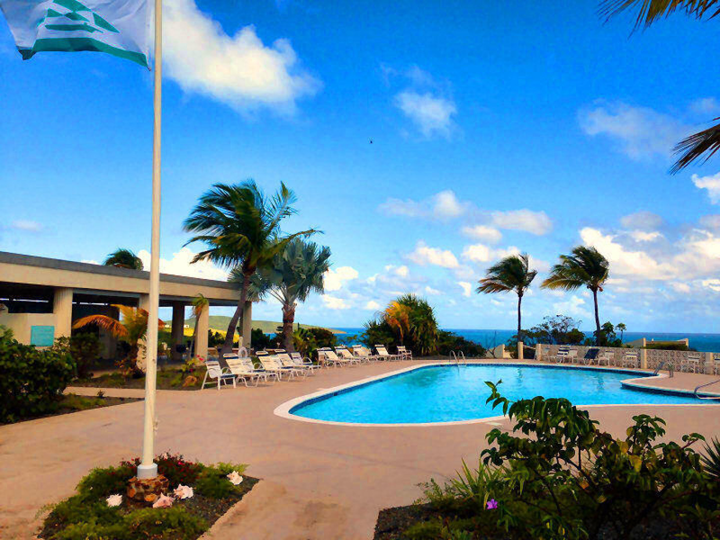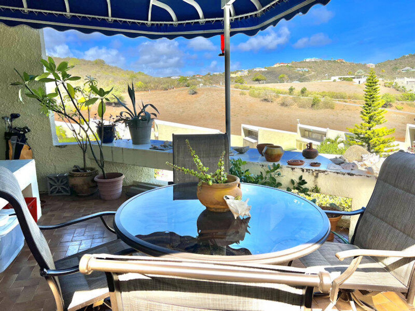 This 1 bed/1.5 bath condo in the sought-after community of The Reef has it all--a spectacular view of Buck Island, unparalleled privacy for a condominium, and two delightful outdoor areas (large patio in front and smaller atrium in back). The inside is a blank canvas, a diamond in the rough and an opportunity to create your perfect space. No amount of renovating can give you what this unit already has--the view, the privacy and the outdoor living area. The rest depends on your imagination and your vision.Upgrades include a full size stack W/D, split A/C, new refrigerator,R/O cold water filter and on-demand water heater.The Reef is gated with a pool,9 hole golf course and Pro Shop, tennis/pickle ball and disc golf.Just a short walk to Teague's Bay beach and Duggan's Reef restaurant.