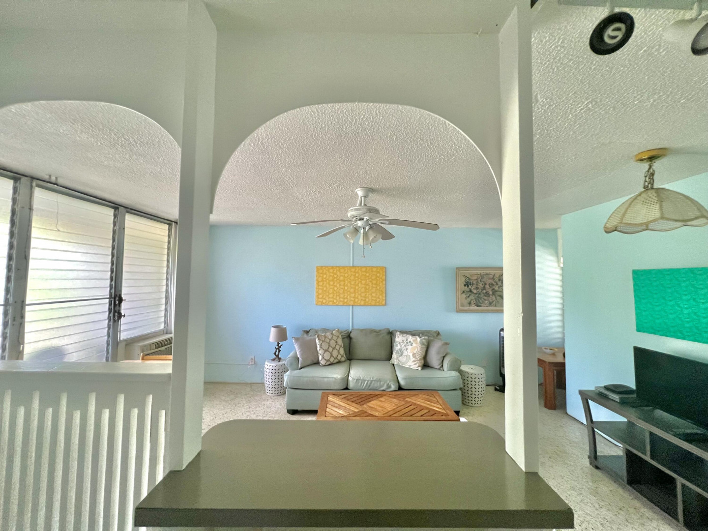 This one bedroom one bath unit is move in ready fully furnished including kitchen wares and linens. The unit is located at the back of the complex on the lower level near the end, making it an ideal location for privacy and convenience without all the stairs. The gated complex is a great location close to shopping and public transportation. Amenities include new ac in bedroom cable tv, laundry room( coin op), pool, gated parking and complex entry, on site dumpster for trash and internet is available for a fee. Tenant to set up Wapa.