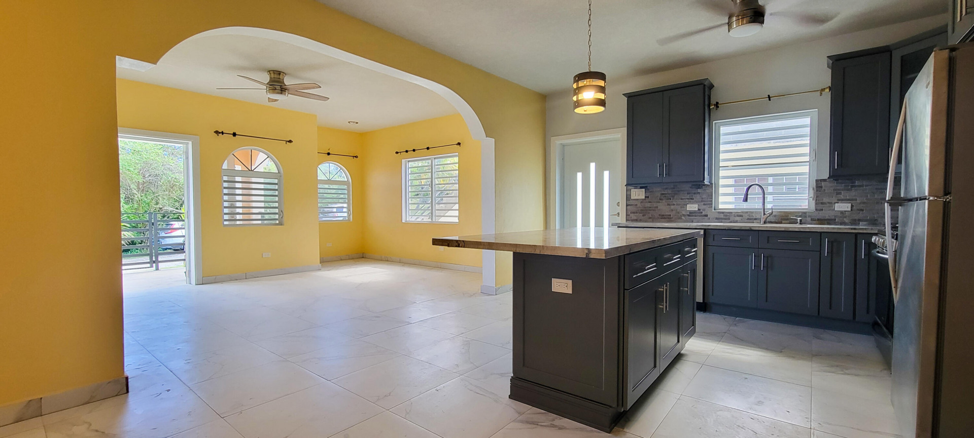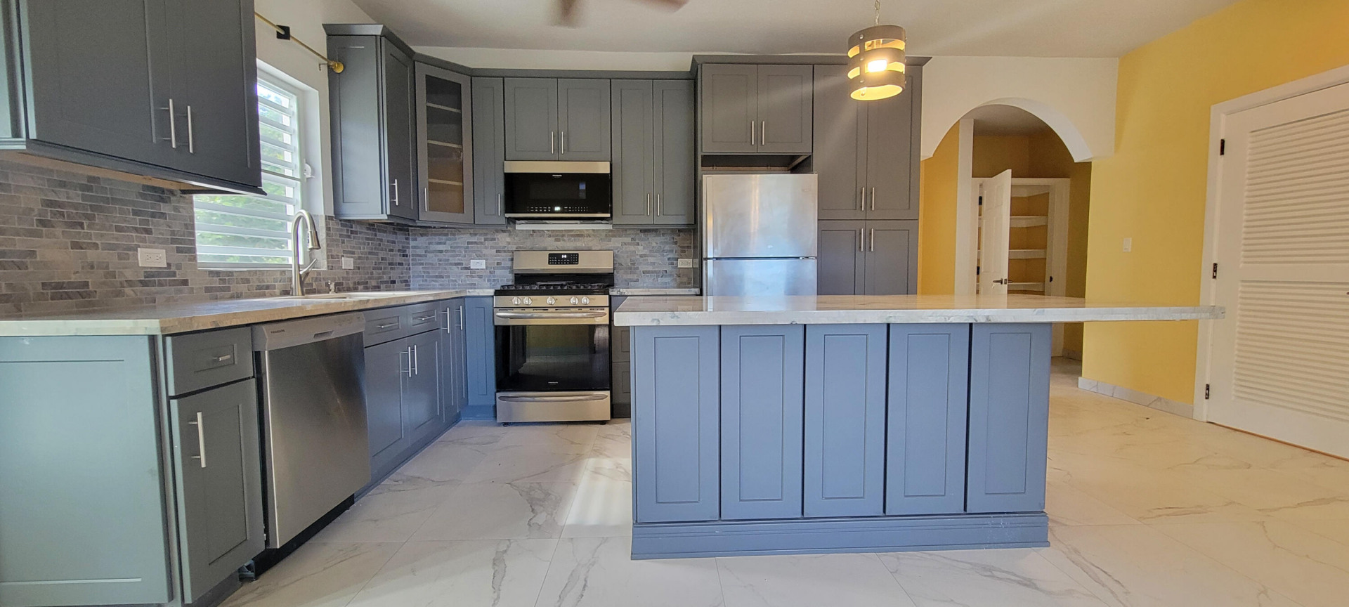 This BRAND NEW - never been lived in airy downstairs home - 3 bedrooms and 2 bathrooms. The kitchen is equipped with stainless steel appliances including a dishwasher. A tiled backsplash and granite counter tops with island leads to the open concept living/dining area. Primary bedroom has ensuite bath and luxurious touches. Ceiling fans throughout the house (total of 6) and split AC's in bedrooms. There is plenty of storage and a laundry room. Property management done by builder/owner. Other details include curtain rods on each window; tile moulding on the floors, beautiful lighting, built in toiletry storage in showers; electric outlets in kitchen island. Beautiful arches, decorative walls, cooling breezes. Concrete driveway and parking slab at the rear of the building.