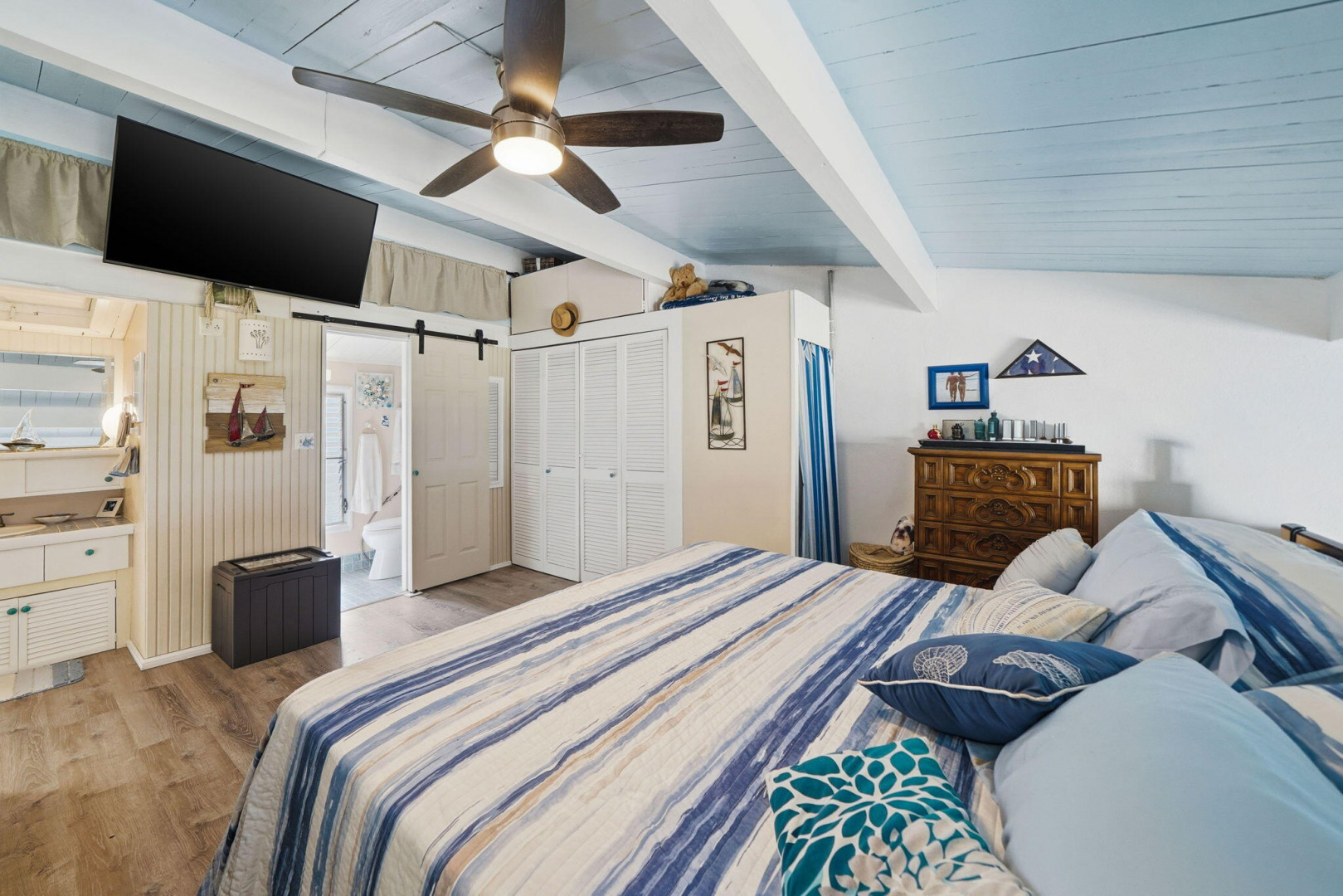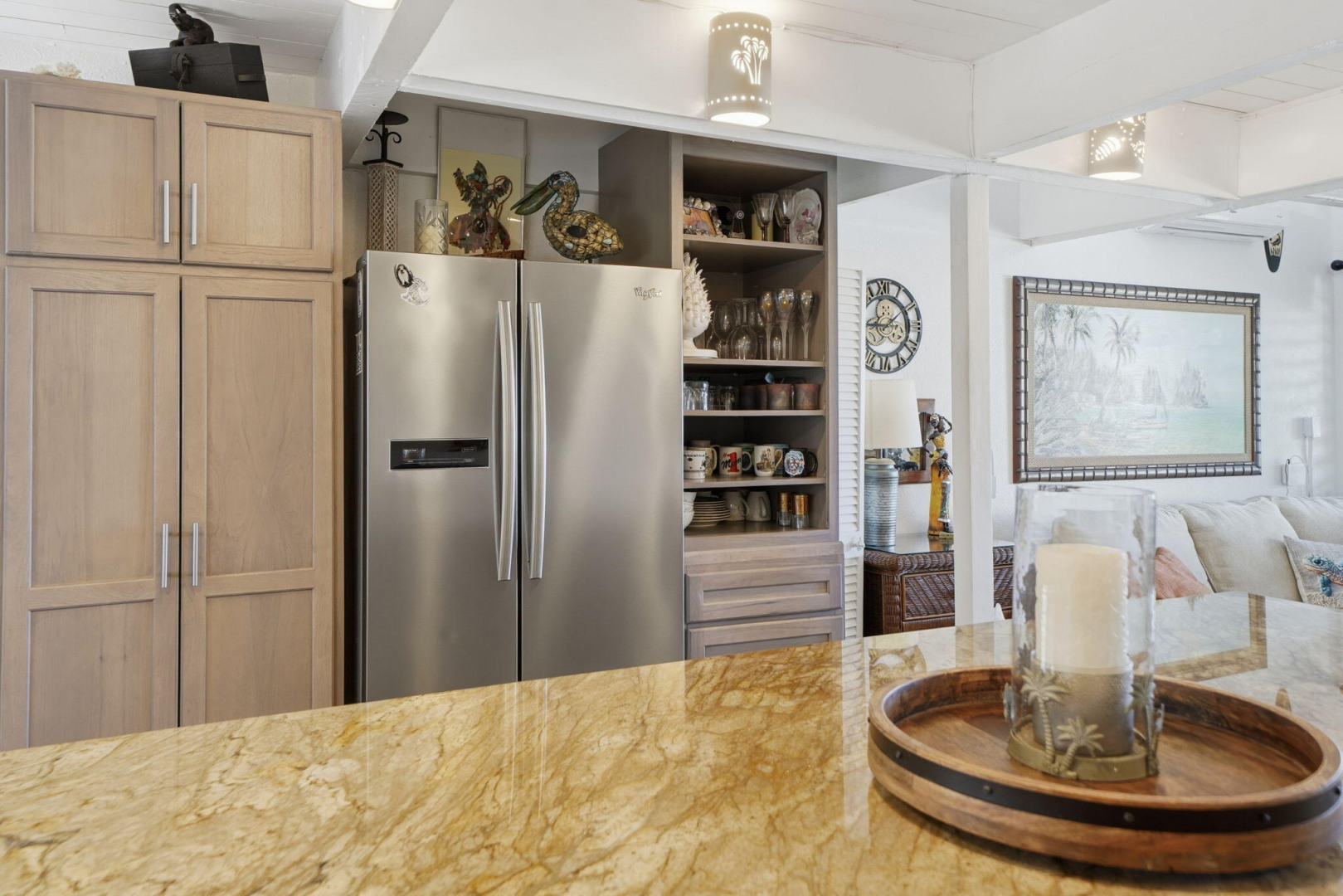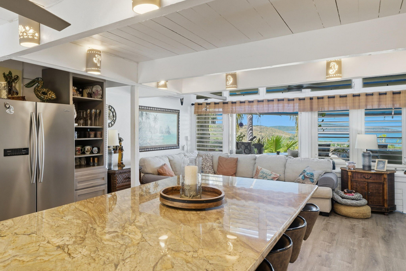 Embrace the ultimate island lifestyle in this stunning turn-key 1-bedroom, 1.5-bath end-unit condo at The Reef, offering breathtaking views of Buck Island. The renovated kitchen showcases granite countertops, new appliances, and modern cabinetry, offer in a sleek and functional space ideal for both everyday living and entertaining. New high-end flooring adds a fresh, modern touch to the interior. Recent improvements also include new windows and doors, enhancing energy efficiency, natural light, and overall comfort. Thoughtfully designed for seamless indoor-outdoor living, it features multiple outdoor seating areas where you can savor ocean breezes, colorful sunsets, and the serene tropical surroundings.Sold fully furnished, this home is ready for immediate enjoyment or rental. The Reef