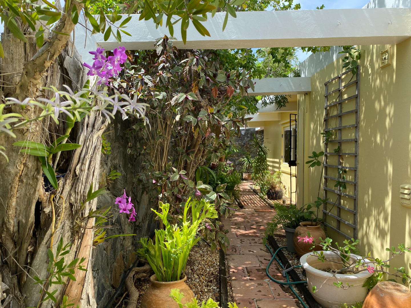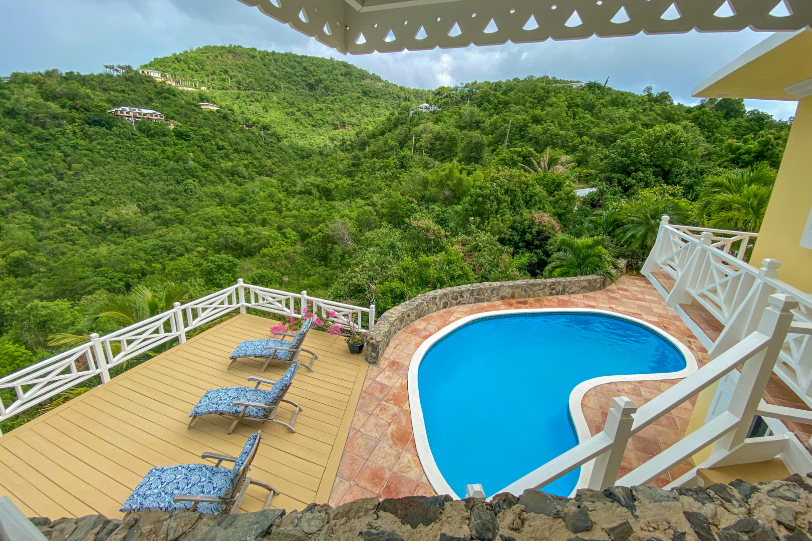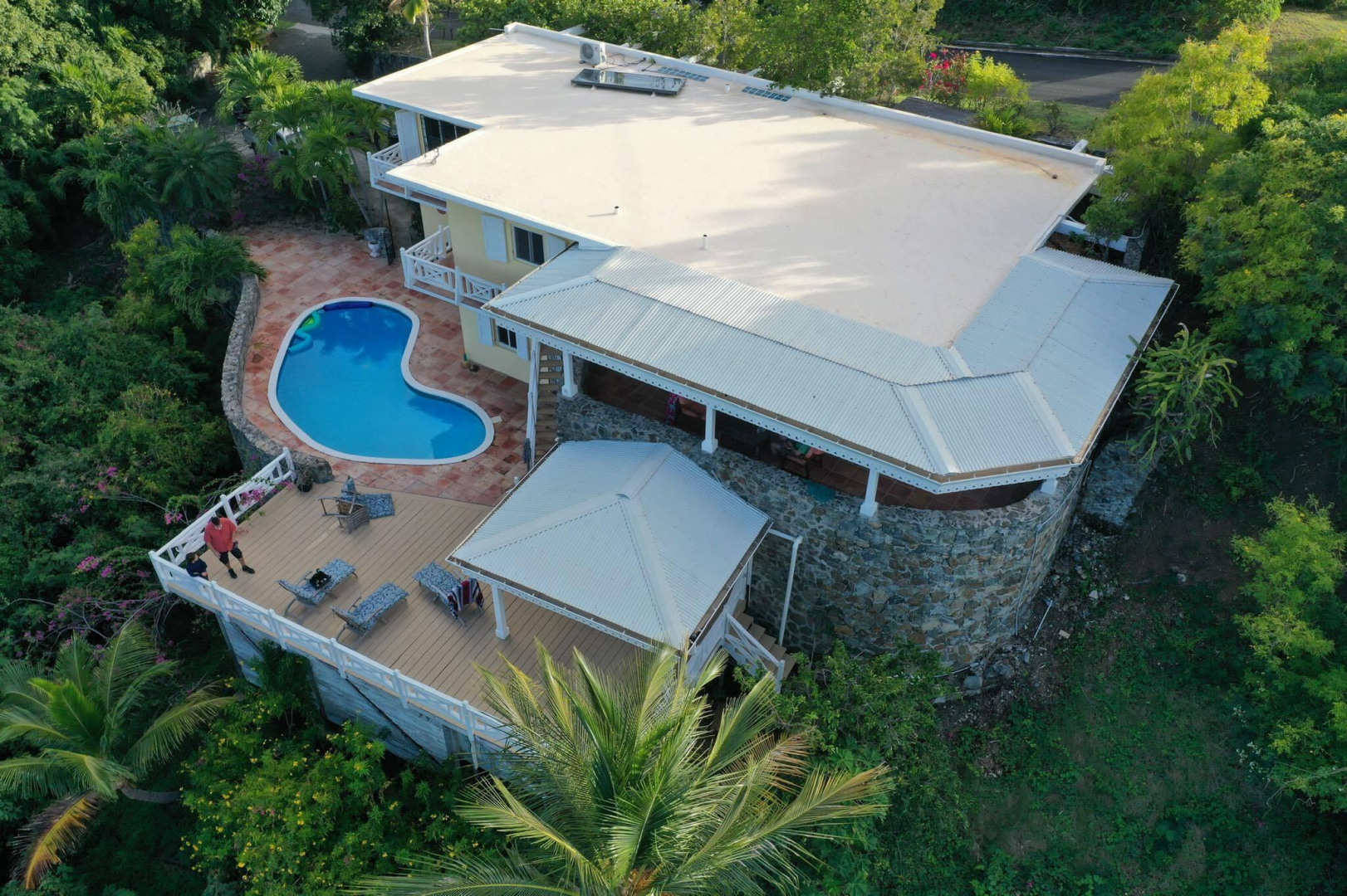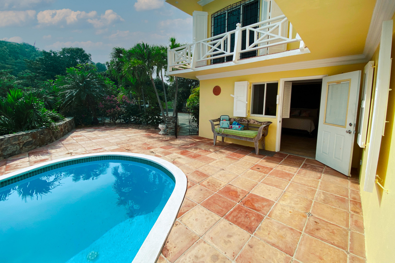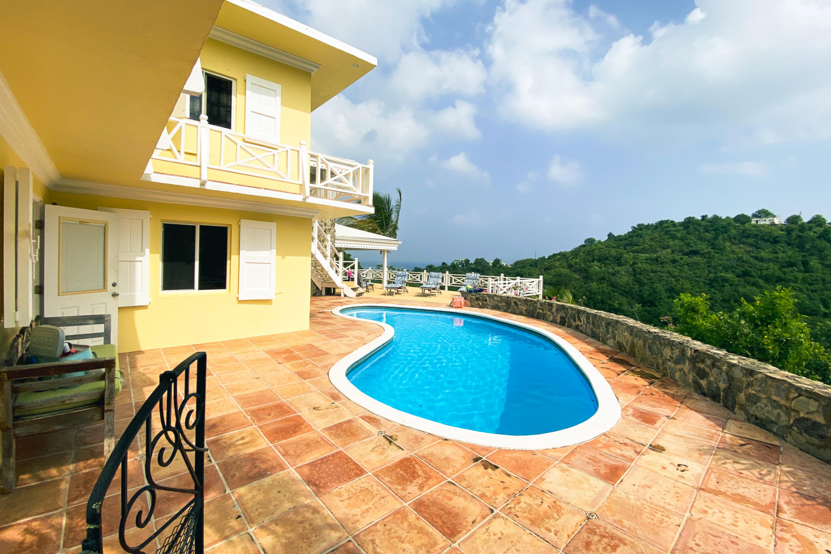 Charming 3 BD 3.5 BA Caribbean home just minutes from downtown Christiansted. Main level features bedroom upstairs with living area opening to a covered gallery and lush orchid garden. Second level features second bedroom and efficiency apartment just steps from pool and expansive deck. Northern sea views, paved driveway,and fruit trees. Included: lawn care, pool service, internet, AC throughout, and automatic switch generator.
