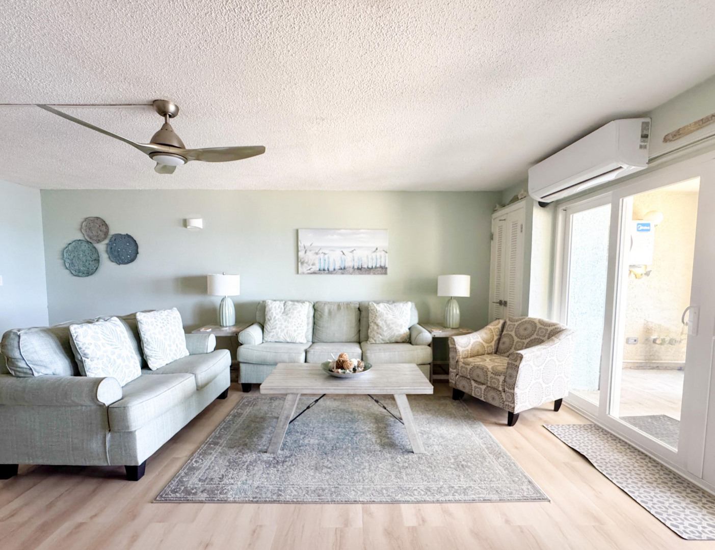 Enjoy fantastic views of Buck Island and the Caribbean Sea from this 2 bedroom 2 bathroom second floor unit. With an updated custom kitchen and modern bathrooms you will feel right at home. Enjoy stunning sunrises and cool Caribbean breezes on the spacious private gallery. This turnkey unit features NEW floors, impact glass sliders, stainless steel appliances, including a new refrigerator, new A/Cs throughout, new full size washer and dryer, and a brand new hot water heater. Relax on the well maintained white sandy beach, or by the pristine pool designed around a historic sugar mill. The complex also has two full size tennis courts. Sugar Beach Condos are centrally located and just a short drive to historic Christiansted where you can enjoy waterfront dining, shopping and daily excursions