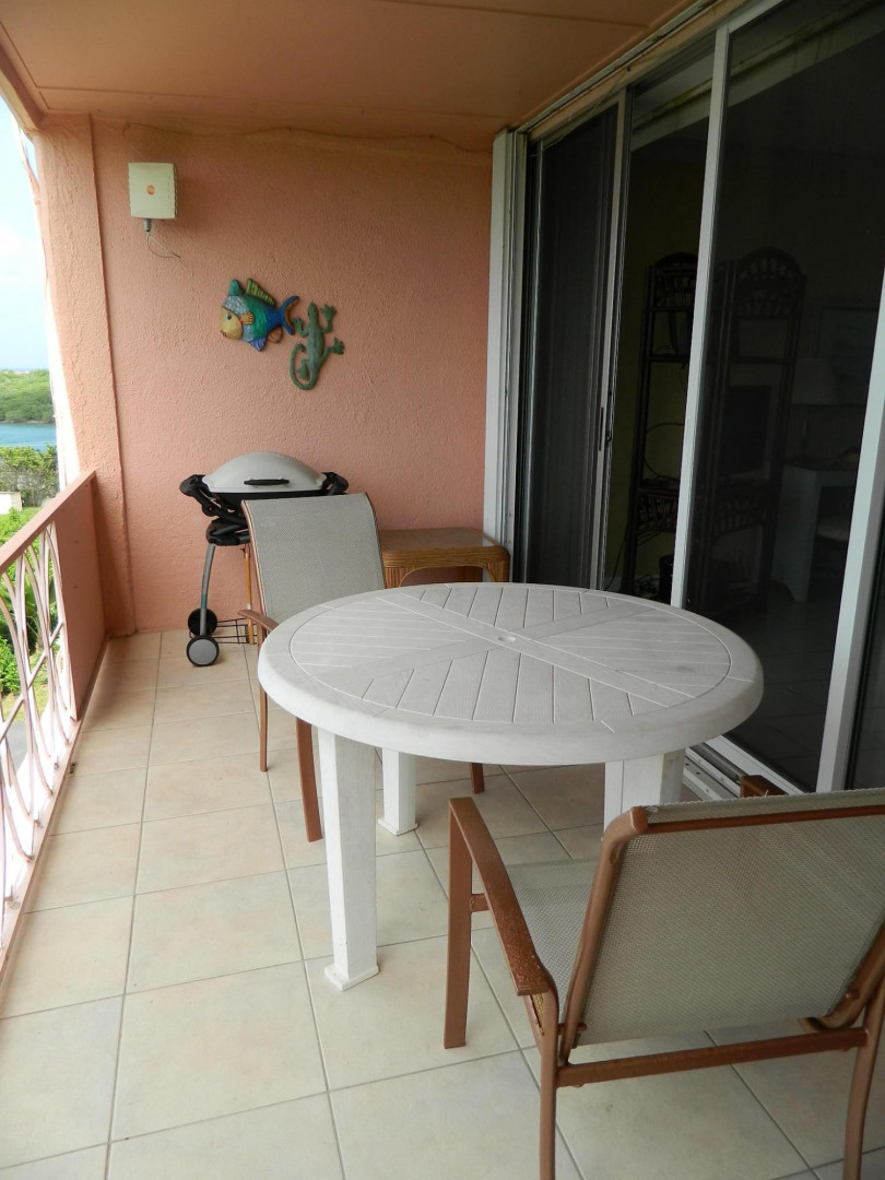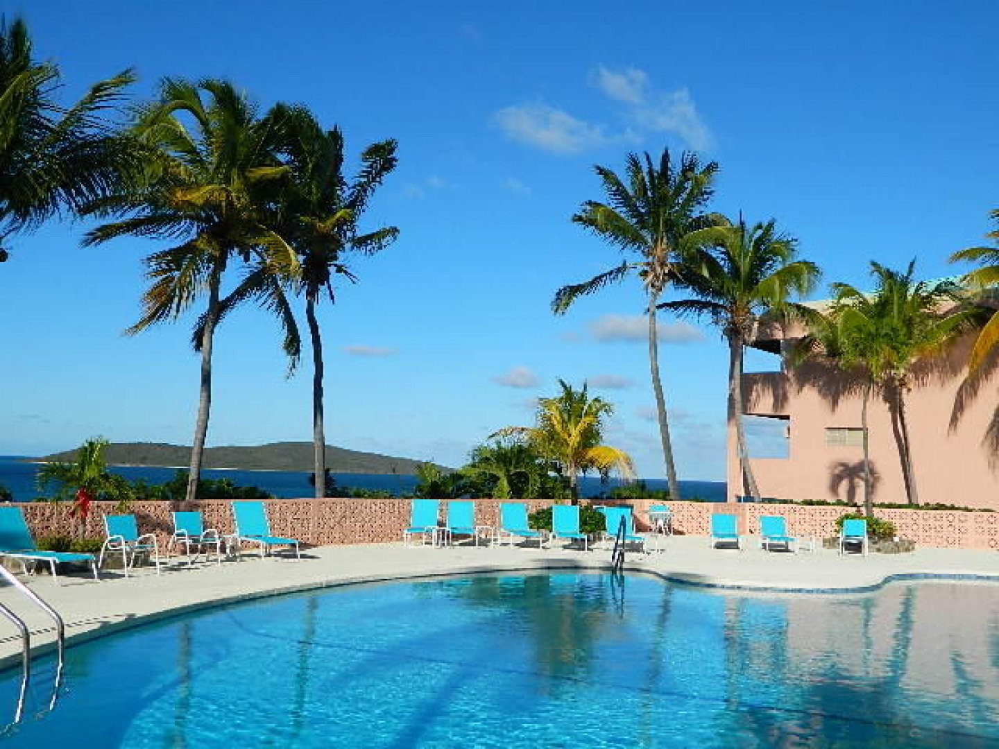 Million dollar view of Buck Island. Spacious 2 bedroom, 2 remodeled baths. Townhouse style with covered patios upper and lower levels to enjoy outdoor living. Upgrades include: Quality tropical style furniture, handpainted faux paint finishes on walls, washer/dryer, two split a/c units, storm shutters. Walk to beautiful pool and restaurant from A Building location. HOA fee includes generator/water/wifi/pest control/full insurance coverage. Owners allowed one small pet. Beaches nearby.