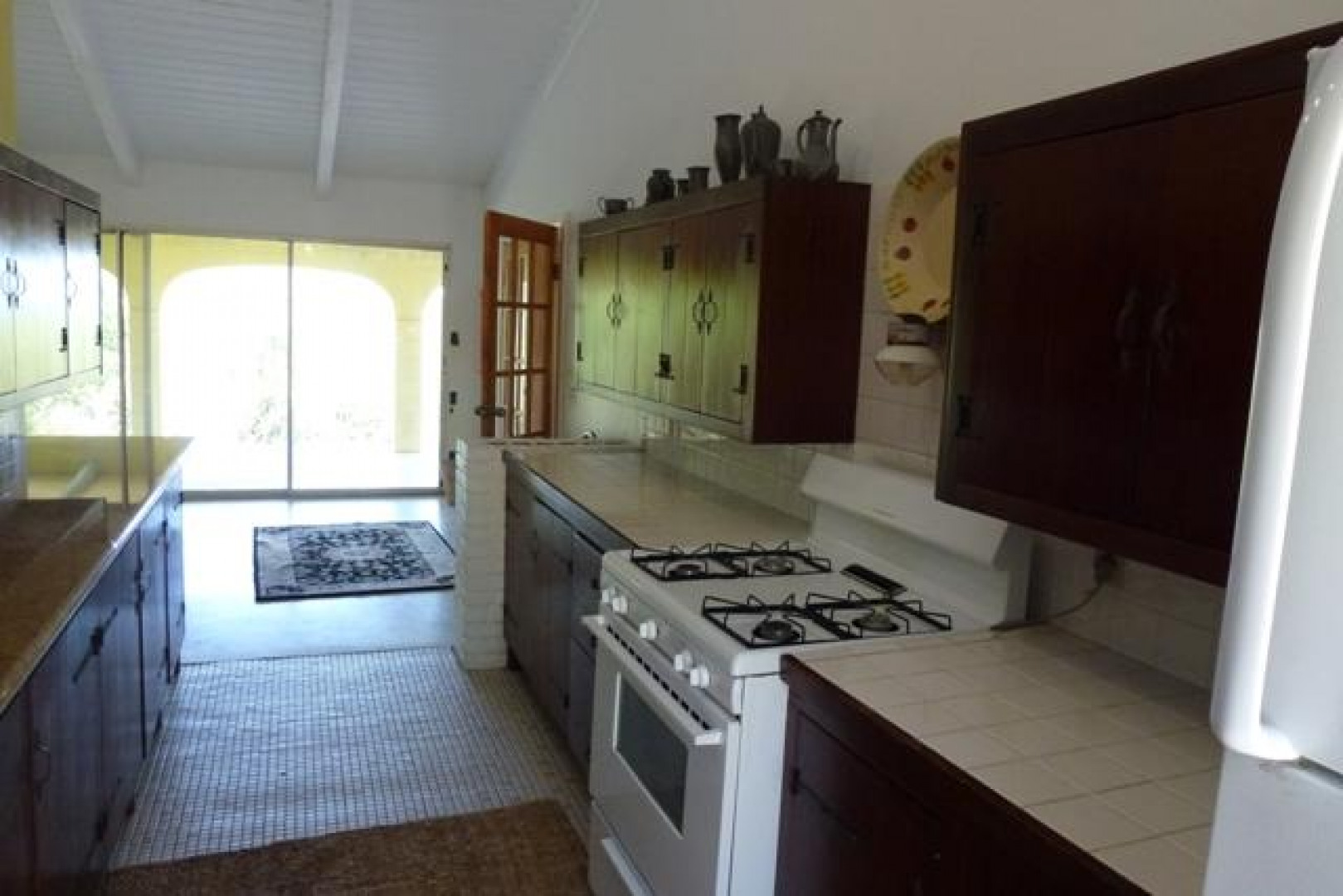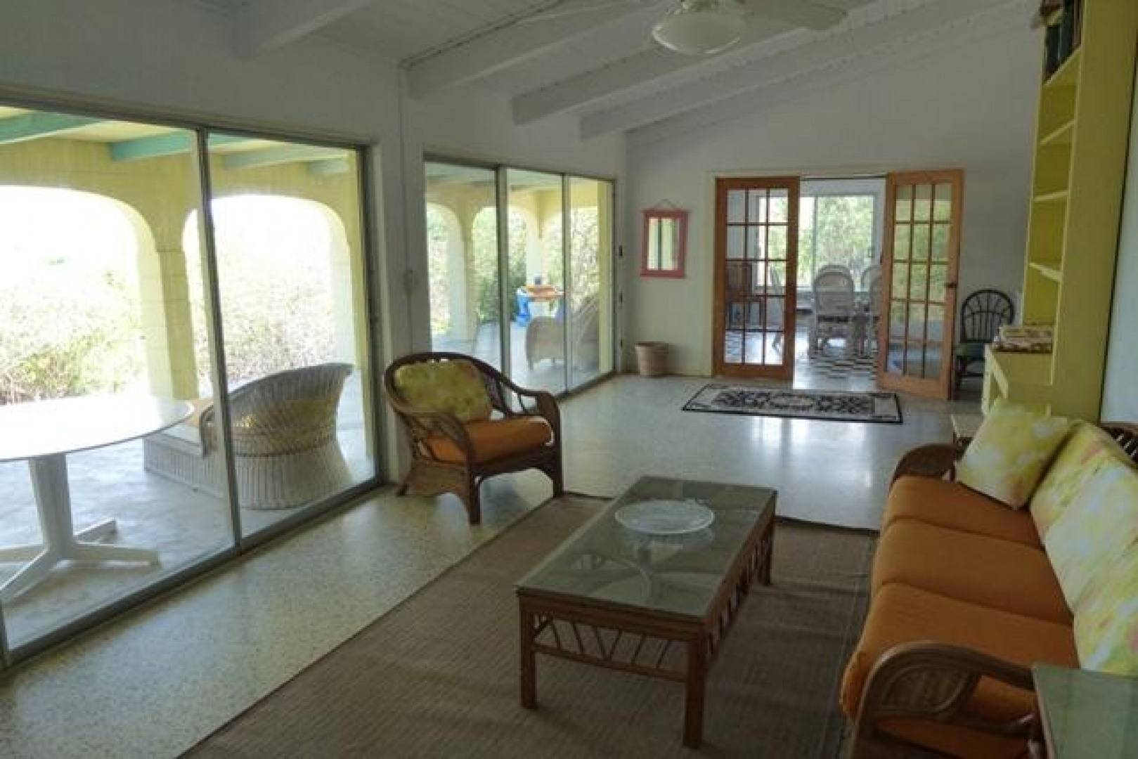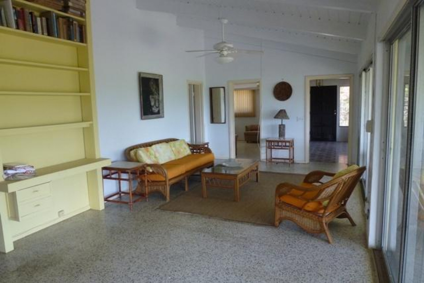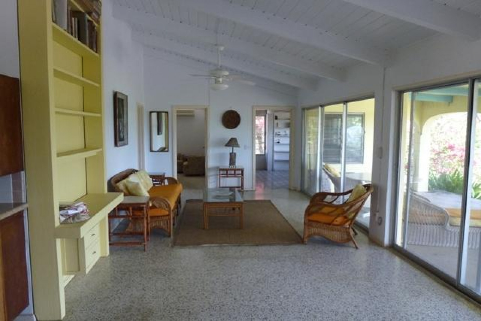 This well located & very private Crucian home on half acre located in Estate St. John offers great views, constant breezes thru wall to wall sliding glass doors, & easy, stress-free living. The expansive, arched, gallery overlooks the sea and C'sted harbor. A walled entrance patio, with fish pond (unstocked), that says "Come and Relax". Two large bedrooms, three bathrooms & another library/officeamong palm trees, bougainvillea and flowering trees which makes for a pleasant location to call a family home. Pets welcomed.