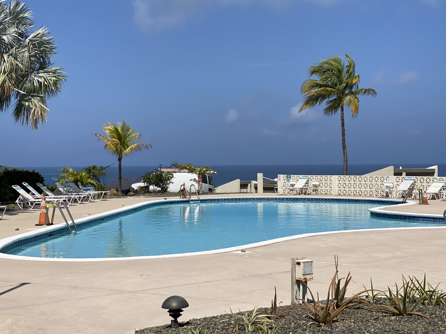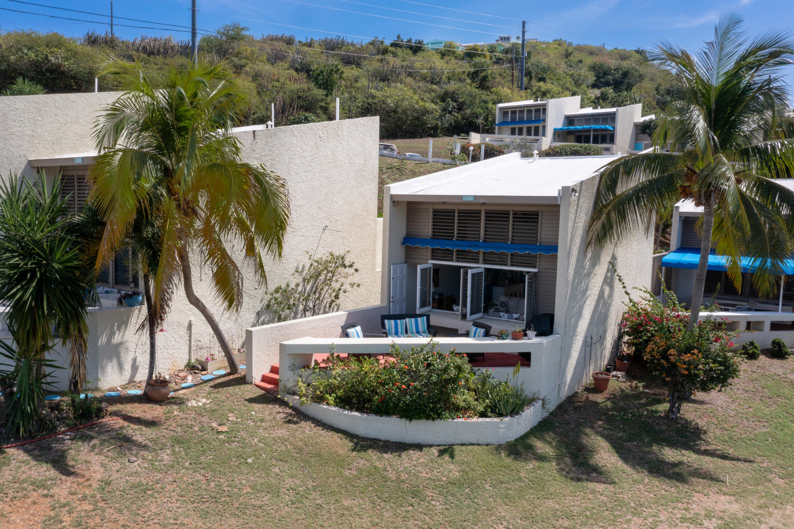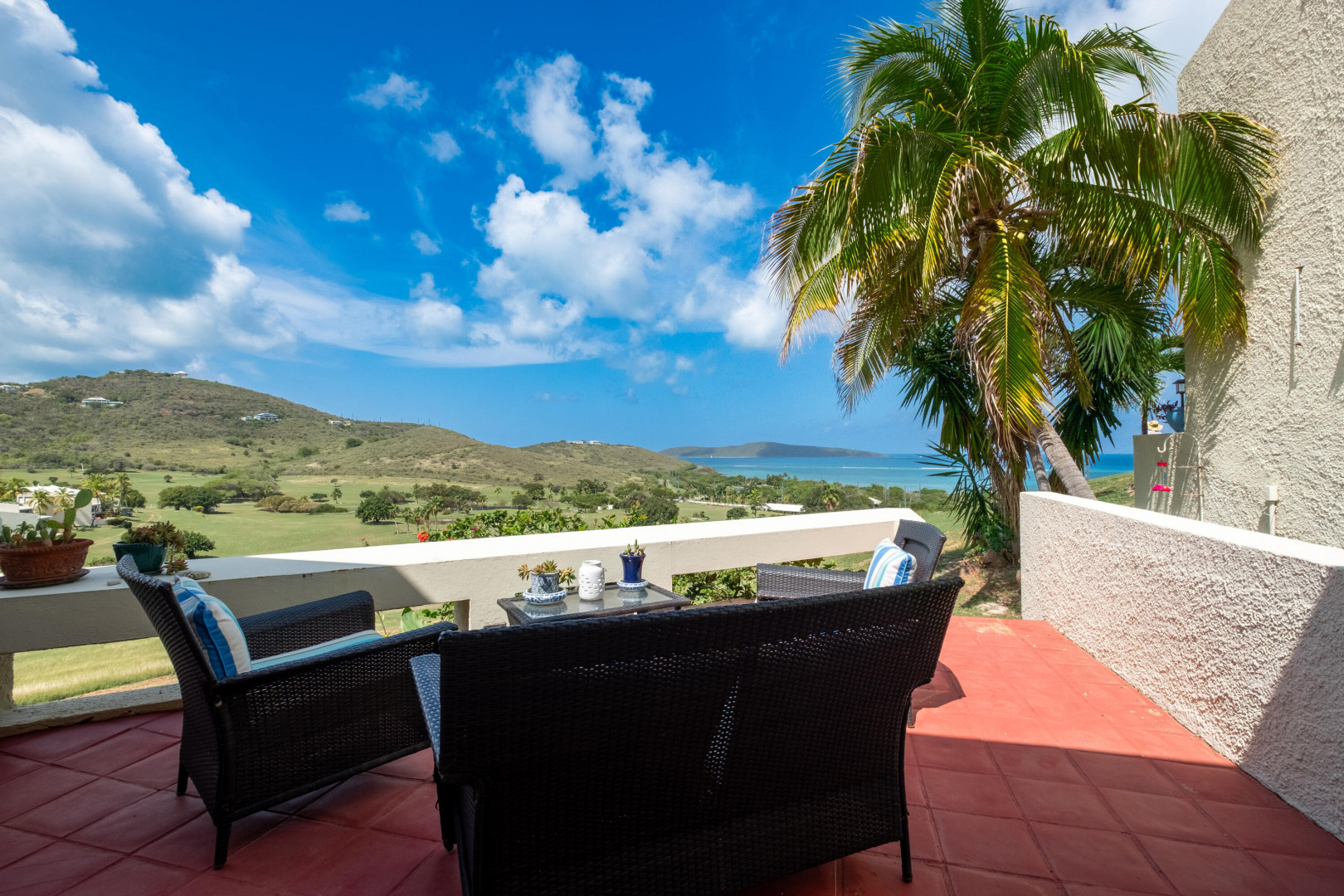 Picture perfect location - a knockout view of Buck Island surrounded by the hues of the Caribbean and framed with a palm tree! Appointed with soothing shades of blue and crisp white this beautiful stand-alone one-bedroom, one and a half bath condo on the golf course is a true island retreat, The open kitchen has a bonus gas stove and new refrigerator. There is a large retractable awning over the sea view patio nearly doubling the living space. Ceramic tile floors throughout, with a sunlit skylight and upgraded bathrooms. Amenities include large pool, golf course, a frisbee golf, tennis & pickle ball courts, a pro-shop, a sandy beach, Ollie's cafe, on-site office, & a gated entrance. Popular Duggan's Reef Restaurant is across the road, one of many eateries close by. See private remarks.