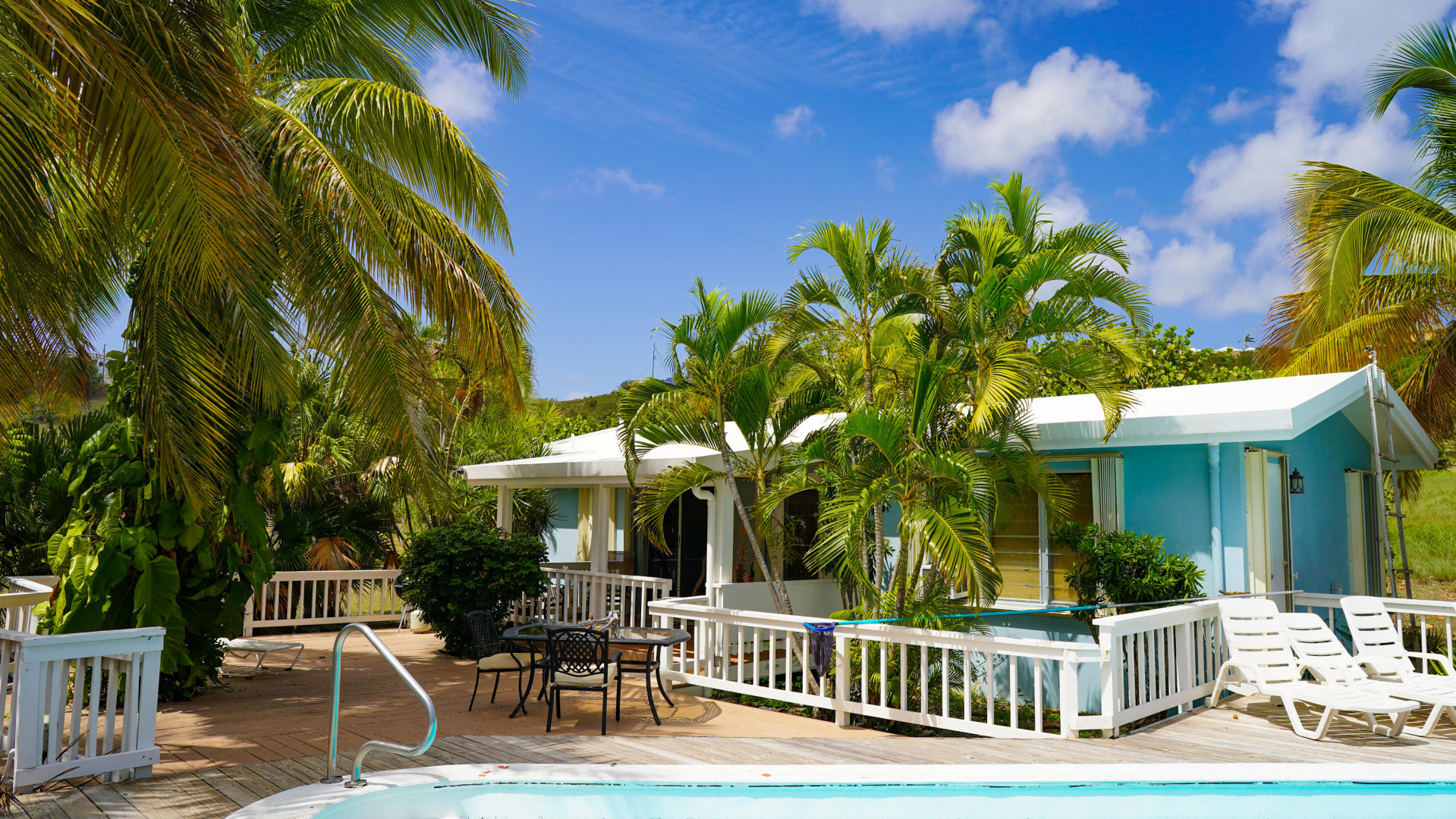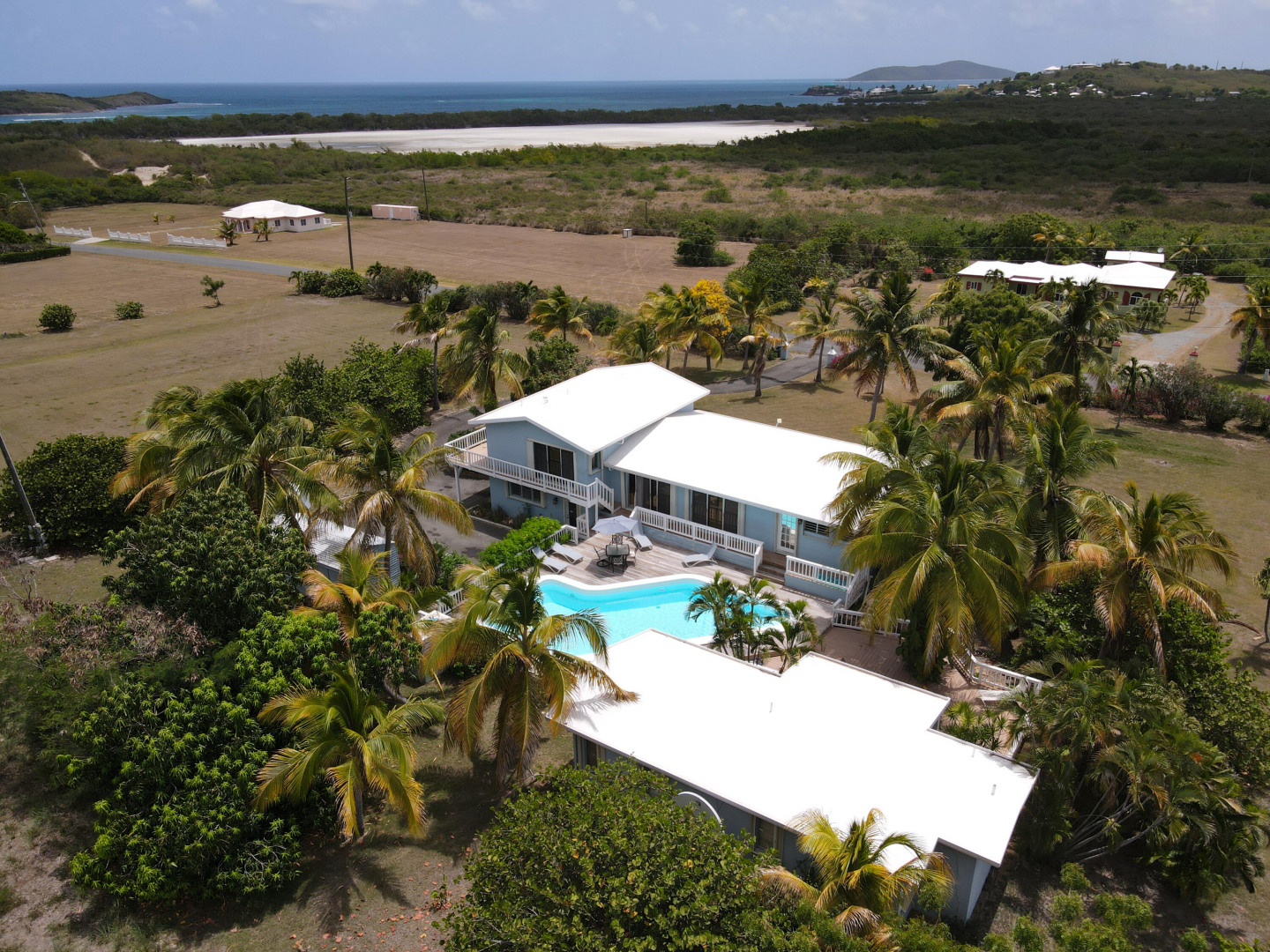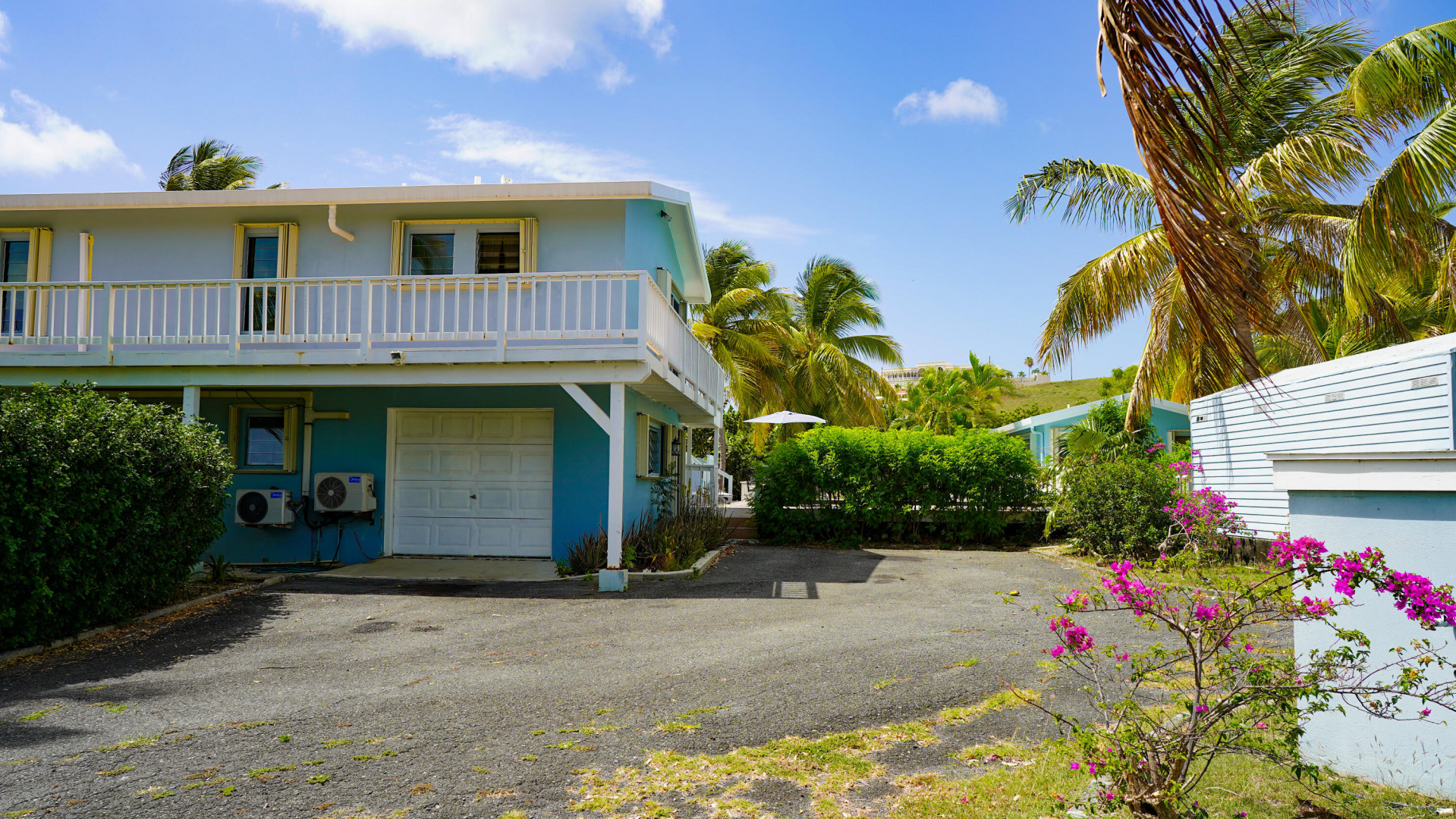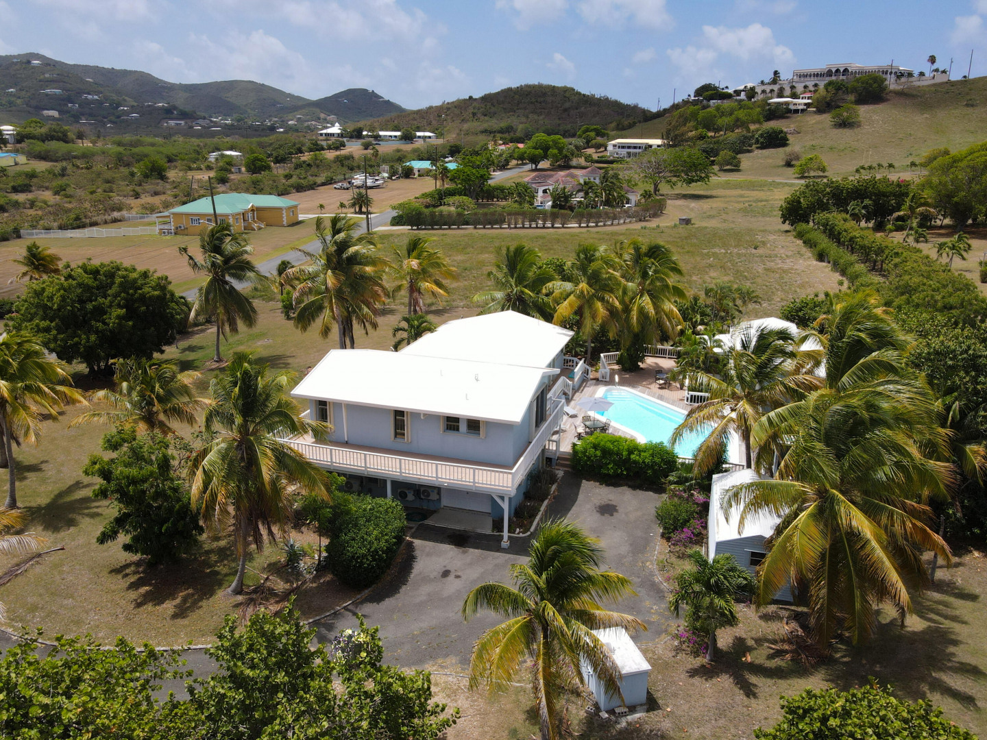 This beautiful 3 bedroom, 3.5 bath Southgate home gorgeously landscaped and surrounded by palm, seagrape and mango trees, is the perfect island home. The driveway is lined with palm trees. Close to 2,300 square feet of outdoor space including a multi layered pool deck, decks circling the bedrooms, dining room and a large patio off the living room. One bedroom, one bath apartment is perfect for rental income or as an in-law suite. One car garage. Views east of the Ms. Bea Road sugar mill and south of Southgate Farms, 7 Hills and All for the Better. Lots of storage space including a shed in back yard.