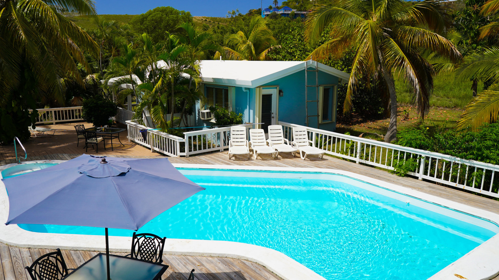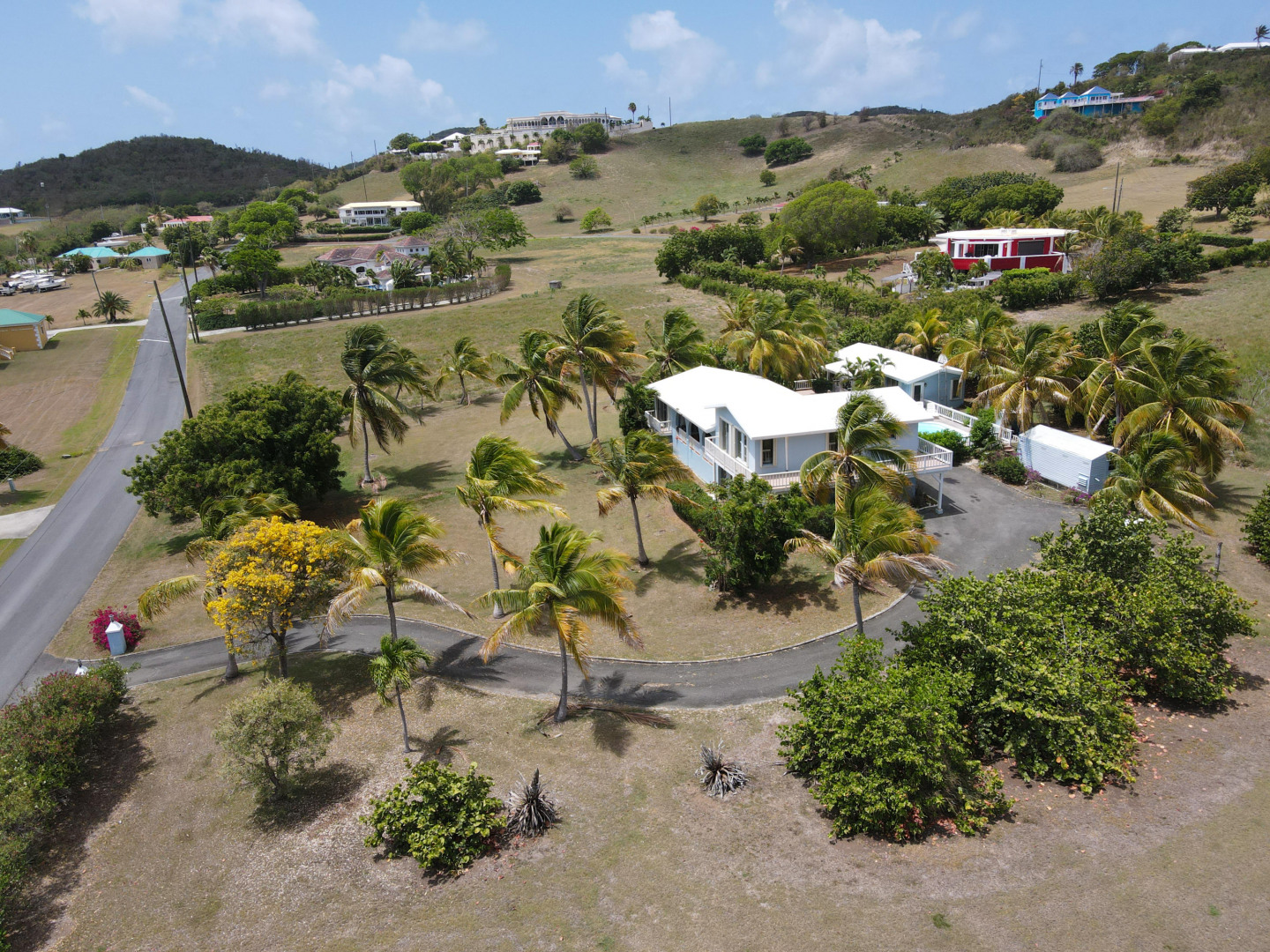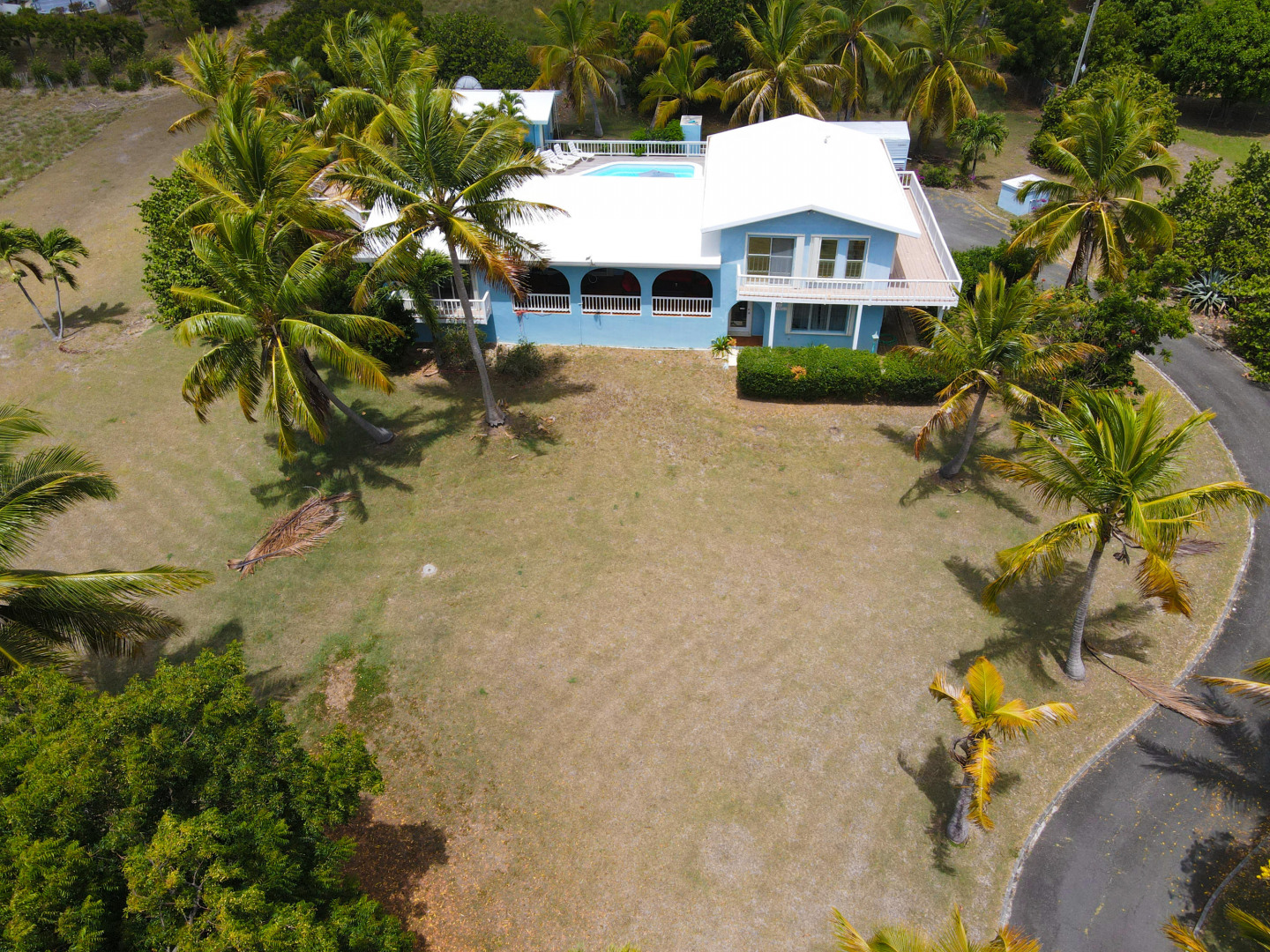 This beautiful 3 bedroom, 3.5 bath Southgate home gorgeously landscaped and surrounded by palm, seagrape and mango trees, is the perfect island home. The driveway is lined with palm trees. Close to 2,300 square feet of outdoor space including a multi layered pool deck, decks circling the bedrooms, dining room and a large patio off the living room. One bedroom, one bath apartment is perfect for rental income or as an in-law suite. One car garage. Views east of the Ms. Bea Road sugar mill and south of Southgate Farms, 7 Hills and All for the Better. Lots of storage space including a shed in back yard.