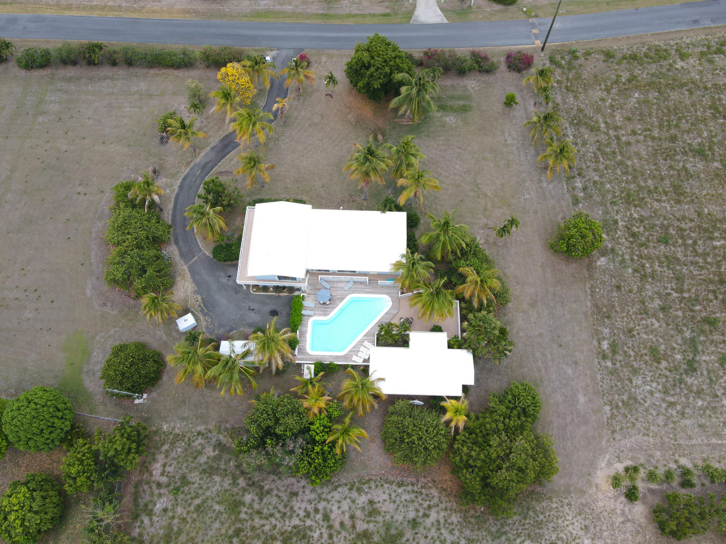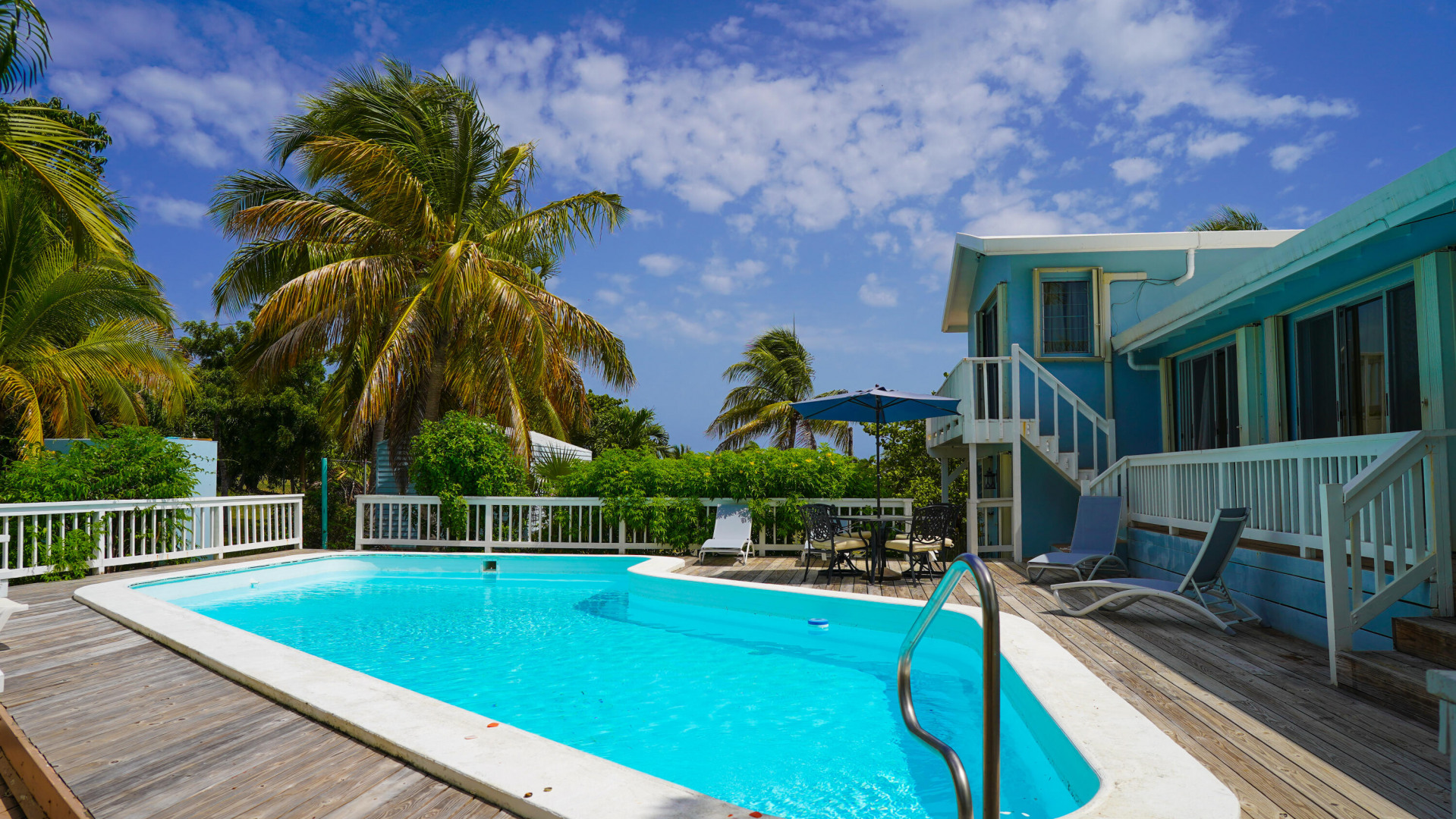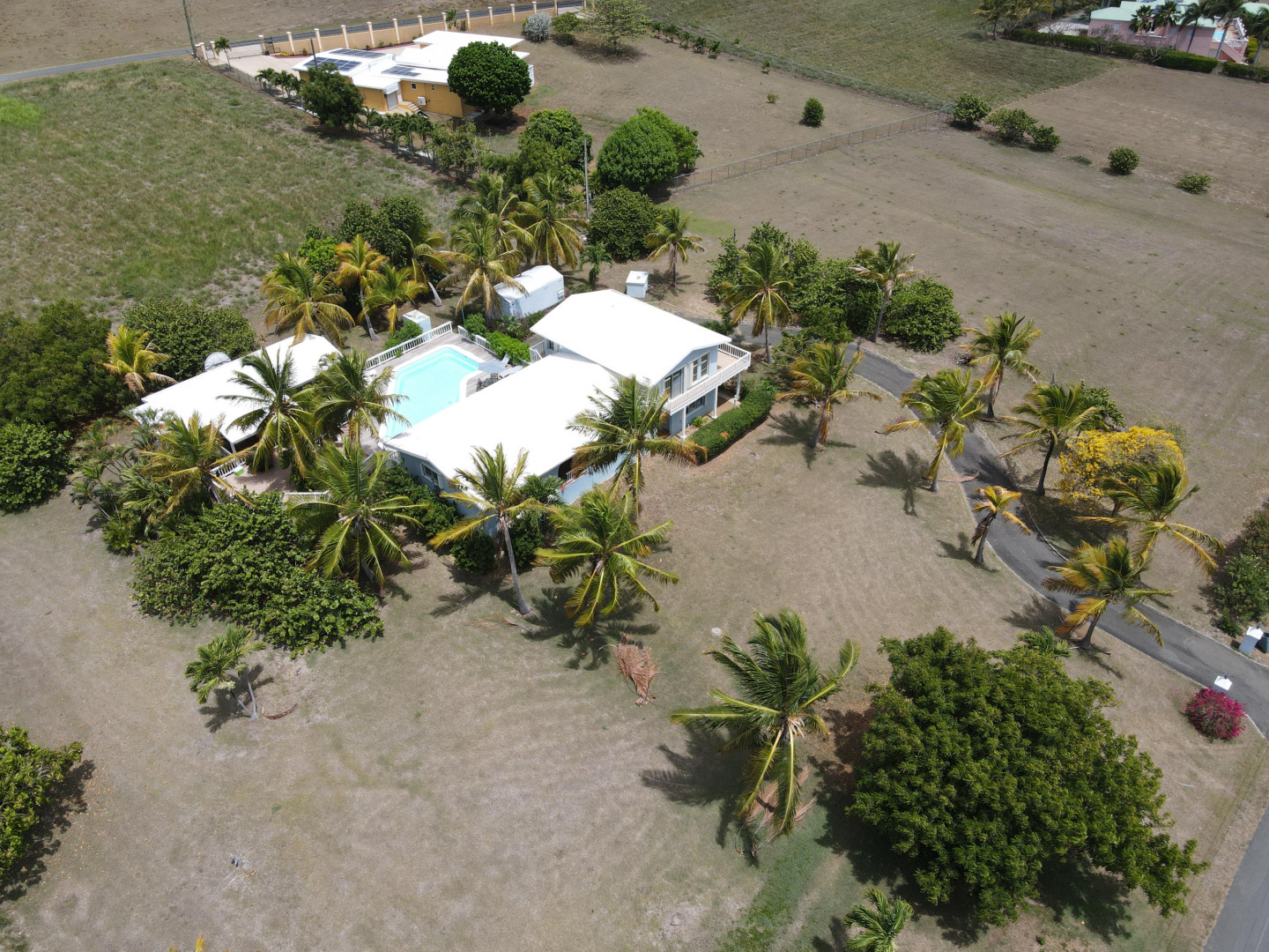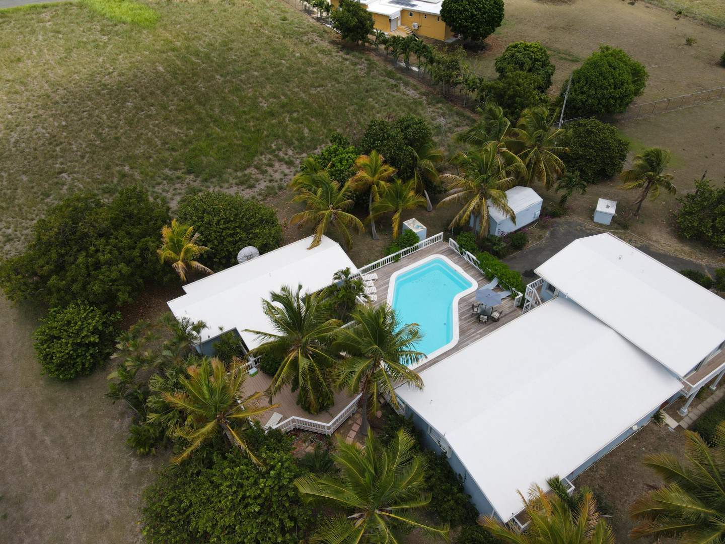 This beautiful 3 bedroom, 3.5 bath Southgate home gorgeously landscaped and surrounded by palm, seagrape and mango trees, is the perfect island home. The driveway is lined with palm trees. Close to 2,300 square feet of outdoor space including a multi layered pool deck, decks circling the bedrooms, dining room and a large patio off the living room. One bedroom, one bath apartment is perfect for rental income or as an in-law suite. One car garage. Views east of the Ms. Bea Road sugar mill and south of Southgate Farms, 7 Hills and All for the Better. Lots of storage space including a shed in back yard.